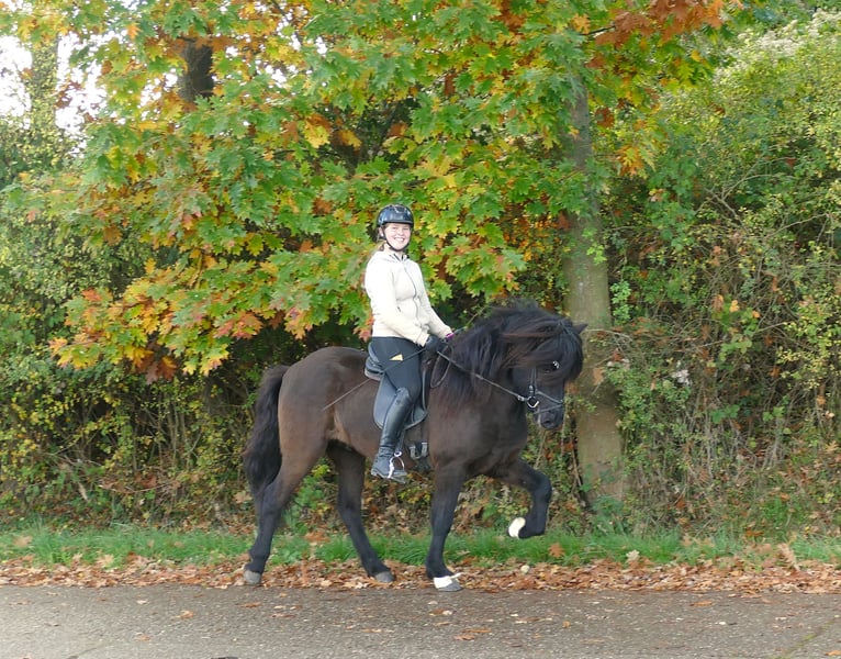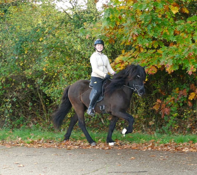 Tindur vom Recherbusch *2020 / 145 cm Schwarzer Tölter mit Wallemähne und Gute-Laune-Garantie Darf ich vorstellen? Tindur — ein schwarzer Wallach mit einer Mähne zum Verlieben (Friesen würden neidisch werden!) und einem Charakter, der einfach Spaß macht. Er ist ein echter Tölt-Profi: immer taktklar, leichtfüßig und dabei so elegant, dass man fast vergisst, dass man im Sattel sitzt. Tindur liegt angenehm leicht in der Hand, geht mit einem mittleren Vorwärts und lässt sich in jeder Situation problemlos regulieren — ob in der Halle, auf dem Platz oder querfeldein- sogar in den Bach ging er gleich beim ersten Versuch! Im Gelände ist er ein richtiger Traumprinz: geht alleine und mit anderen, mutig vorne weg oder mit Abstand hinterher, das ist ihm völlig gleich. Ebenfalls wunderbar: in jeder Situation geht Tindur schreitenden, gelassenen Schritt am langen Zügel. Ein Traum zum Ausreiten. Auch im Umgang zeigt er sich von seiner besten Seite: freundlich, unkompliziert und menschenbezogen. Für wen ist Tindur der Richtige? Für alle Reiter, die einen weichen, bequemen und leicht zu reitenden Tölt schätzen.