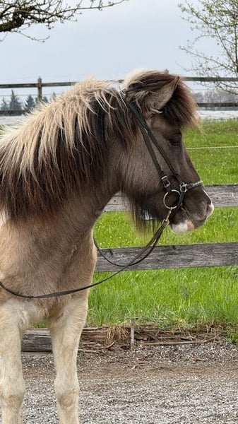 Svalinn is an impressive, very elegant 6-year-old Icelandic gelding with an extraordinary presence. Standing at a stately 1.42 meters and sporting his rare, stunning wind-color pinto coat (with plenty of white, wind-colored neck, colorful mane, as well as a star and snip), he immediately captures everyone's attention. In character, Svalinn impresses with his exceptionally kind, pleasant, and balanced nature. He is always polite with humans and animals, very people-oriented, and exudes a calming inner serenity. He comes from our own carefully managed breeding program. Svalinn is free of eczema, regularly vaccinated and dewormed. Lineage: His sire is Sprettur frá Gardi, a son of the renowned Klettur frá Hvammi. His dam, Saedís von Bachäcker, is a very gentle natural mare from our breeding. Her sire is Prins du Schlossmatt (by Keilir frá Midsetju). Training & Usage: Svalinn is solidly trained and has been worked in various disciplines. He is ridden both in the arena and the indoor hall, and is traffic and trail safe (currently mainly during walks). He is familiar with diverse exercises, including: - Groundwork (e.g., Tellington Method) - Longlining in a cavesson - Double longeing Under saddle, he is motivated, eager to perform, and pleasantly responsive. His temperament is well-balanced – neither hot nor overly spirited. Gaits: Svalinn is an uncomplicated four-gait gelding with a steady gait distribution. His particularly soft, rhythmical tölt is very easy to collect and is currently being further developed. Overall, he shows good movement potential and offers opportunities for both ambitious leisure riders and occasional competition use. Special features: - Very well-behaved and reliable - Curious and playful (knows, for example, horse football and pole work/cavaletti) - Calm with new experiences and attentive to the rider - Social and easygoing within the herd (knows mares and geldings) Svalinn is the ideal partner for riders seeking an honest, talented, and lovable horse – perfect for relaxed rides, versatile training, or even first competition experiences. If desired, Svalinn can continue to stay with us in retirement. Health & Care Status: Eczema-free, healthy, and in excellent condition.
