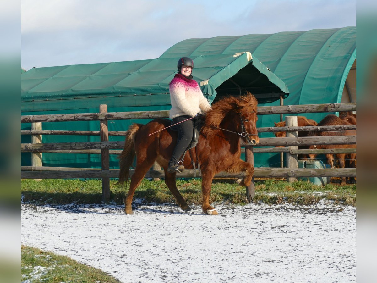 Red Diamond Neisti is a promising young Icelandic gelding who already demonstrates impressive potential through his age-appropriate, professional training. As an elegant four-gait horse, he impresses with light-footed, rhythmical movements and a particularly beautiful, balanced canter—easily and effortlessly responsive, even on small circles. He is familiar with groundwork, lunging, and riding both indoors and outdoors. Neisti has already experienced a variety of situations and works with focus and reliability. He is sensitive to aids, offering his rider a refined, harmonious riding experience. Thanks to his good rideability and natural willingness to perform, he is suitable both as a talented competition horse and as an uncomplicated, motivated partner for leisure riding. He is well-behaved in handling, well-socialized within our gelding herd, and relaxed when being trimmed by the farrier. A young gelding with a bright future—attentive, elegant, and ready for new challenges. Neisti is looking for a person who wants to further develop his potential and grow together with him. Currently, he is suitable for a confident, relaxed teenager or an ambitious adult—not an absolute beginner’s horse, but also not particularly demanding.