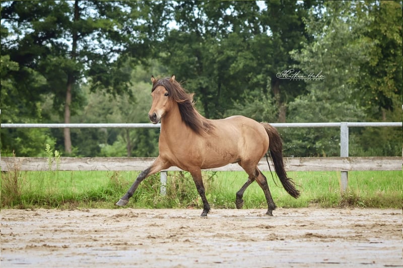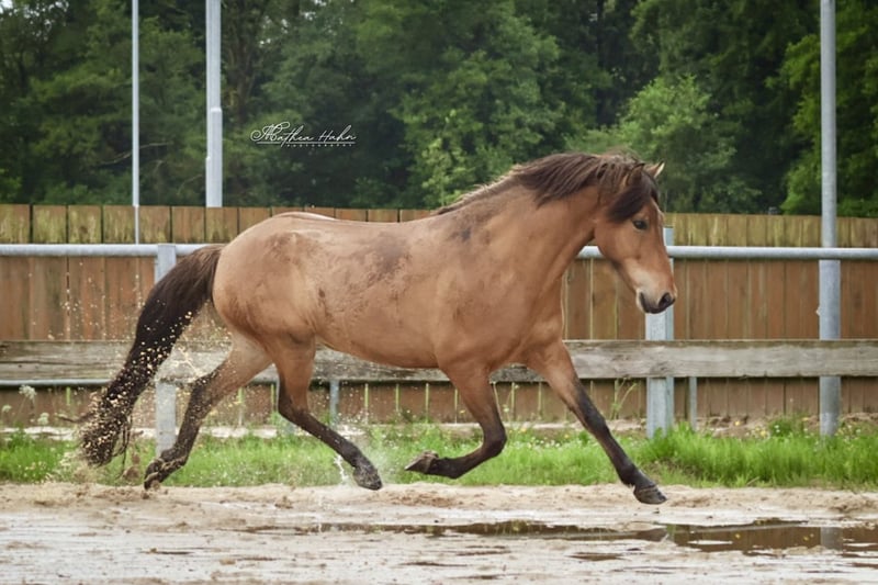Mímir van Hellubrún *2019 in Duitsland 1,43m V: Lukkuriddari frá Pétursbergi VV: Lukku-Láki frá Stóra-Vatnsskarði (8.60) M: Friða VM: Leistur vom Habichtswald (8.33) Mimir is een vriendelijke jonge ruin die zich momenteel in de basisopleiding bevindt. Hij wordt zorgvuldig en veelzijdig opgeleid. Mimir kent grondwerk, loopt goed als handpaard en gaat al veilig in gezelschap het terrein in. Hier toont hij zich moedig met veel tölt. Hij is daarbij eerder ontspannen, altijd coöperatief en gaat alles zelfverzekerd aan. Mimir is vijf-gängig ingesteld met veel tölt- en passveranlagung, maar kan ook goed en energiek draven. De galop is momenteel nog niet ontwikkeld. Hij reageert fijn op de ruiterhulpen en doet altijd zijn best om alles goed te doen. Bij onbekende mensen kan Mimir in het begin wat sceptisch zijn in de omgang. Wanneer hij zijn mensen kent, is hij echter altijd zeer aanhankelijk. Ook zijn moeder was al bij mij in opleiding. Zij toonde zich altijd fijn, coöperatief en getalenteerd met veel gangvermogen. Vanwege zijn opleidingsniveau is Mimir (nog) niet geschikt voor onervaren ruiters. Met verdere opleiding zal Mimir zeker een geweldige betrouwbare eindeloze töltpaard worden met een mooie uitstraling. Prijs categorie B: 5.000 - 10.000€ Van particulier Locatie 29614 Soltau Vanwege de toegenomen ruitertoerisme en om dit de paarden te besparen, reken ik een vast bedrag van 40€ per afspraak. Dit wordt natuurlijk bij aankoop terugbetaald.