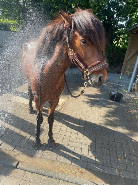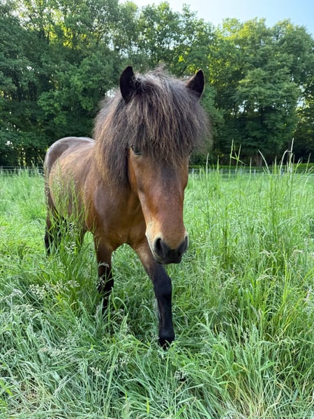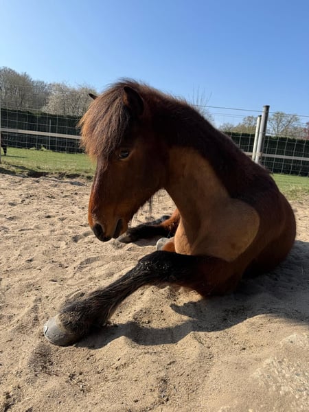 IJslander ruin, hengst uit 2018 met een stokmaat van 136 cm, mensgericht, speels en knuffelig. Sociaal in de kudde, alert en zeer werkwillig. Over hem: Hij is gewoon een geweldige vent – ondeugend, ongelooflijk lief en vol karakter. ’s Ochtends in de stal tovert hij meteen een glimlach op je gezicht wanneer hij nieuwsgierig naar je toe komt. Hij is vriendelijk, open, soms charmant ondeugend en speelt graag liefdevol met zijn maatjes – maar stopt onmiddellijk als je „stop“ zegt. Een karaktersterk, gevoelig en simpelweg een schattig paard zoals je niet vaak tegenkomt. Wat betreft zijn kwaliteit: Hij beschikt over veel en goede tölt, is 4,5-gangend en de pas is nog niet verder ontwikkeld. Alle gangen kunnen goed en duidelijk worden gewerkt. Onder het zadel toont hij veel go en energie, vooral in het terrein is hij voorwaarts en loopt hij graag sneller, maar hij is daarbij zeer fijn te reguleren. Geschikt voor ruiters die terrein en kleinere wedstrijden willen combineren. Hij is geen beginnerspaard, omdat hij gevoelig reageert op hulpteugels en een rustige, voorzichtige hand met fijne, duidelijke hulpen nodig heeft. Bij de juiste ruiter is hij extreem gemotiveerd, wil hij graag gefallen en biedt hij veel potentieel voor verdere opleiding. Opgeleid in de bak, op de piste en in het terrein, bekend met longe en dubbele longe, circustrucs en kleinere wedstrijden. Hij is smid- en trailerproof, over het algemeen onbevreesd, maar zeer fijn en alert in de omgang. Hij staat eigenlijk in 41379 Brüggen, maar momenteel voor training in Swalmen (NL) en kan daar bezichtigd worden. Ik verkoop hem met pijn in mijn hart vanwege tijdgebrek. Ik hoop dat hij een thuis krijgt waar hij voldoende aandacht krijgt en verder gestimuleerd en uitgedaagd wordt – want dat is precies wat hij liefheeft en nodig heeft. Het zou mooi zijn als hij weer in een kleine kudde kan leven.