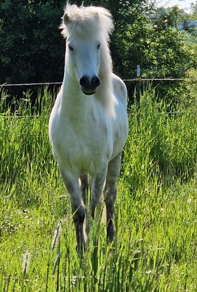 Hjör is een expressieve, harmonieus gebouwde IJslandse ruin, een hengst met een betoverende manen en een schofthoogte van ongeveer 140 cm. Als jonge ruin toonde hij volgens het beoordelingsrapport viergangen met weinig tölt, wat ik ook niet verder heb gestimuleerd – daarom wordt hij momenteel als driegangen aangeboden. (Algemene score beoordelingsrapport voor veulens 8,21 met de beoordeling: "Jong hengstveulen met uitzonderlijk goede bouw, fijne reacties en veerkrachtige gangen met zeer goed ruimtegebruik.") Hjör beschikt over de volgende eigenschappen: - Zeer goede hoeven, ongeschoeid – voor langere ritten in het terrein heeft hij passende hoefbescherming. - Gezond, regelmatig gevaccineerd, ontwormd en eczeemvrij. - Loopt betrouwbaar en zenuwsterk (binnen de groep) het terrein op, ook graag met fiets en/of hond als begeleider. - Verkeers- en wegveilig. - Kent de manegewerkzaamheden, maar geeft de voorkeur aan het terrein. - Heeft vanwege zijn leeftijd een duidelijke en liefdevolle leiding nodig. - Herdentolerant, eerder dominant. - Brav bij de hoefverzorging. - Gemakkelijk in de omgang, reageert echter gevoelig op hectiek, druk of lawaaierige stallen. - Kan geen hooi met silage verdragen. - Equidenpaspoort aanwezig. - Is door de fokker gekocht uit een gerenommeerde IJslandse fokkerij. Momenteel staat Hjör overdag in een kleine ruinengroep, ’s nachts in een paddockbox. Een vergelijkbare rustige omgeving zou ik ook in de toekomst voor hem wensen. Ondanks zijn lieve aard is Hjör geen beginners- of kinderpony en niet geschikt voor een rijschool. Goede rijvaardigheden en interesse om hem verder te begeleiden en regelmatig te belasten (bijvoorbeeld grondwerk, buitenritten) zijn vereist. Hij wordt momenteel bereden om hem verder te ontwikkelen en op te leiden. Hjör zoekt een persoon die hem tijd, geduld en hart geeft. Hij wordt om omstandigheden afgestaan, plaats gaat voor prijs. Een aankoopkeuring (AKU) kan op kosten van de koper uiteraard worden gedaan. Om recreatief rijden te voorkomen, wordt er een proefritvergoeding van €30 gevraagd – deze wordt bij aankoop volledig verrekend. Zadel en bit worden tegen meerprijs aangeboden.
