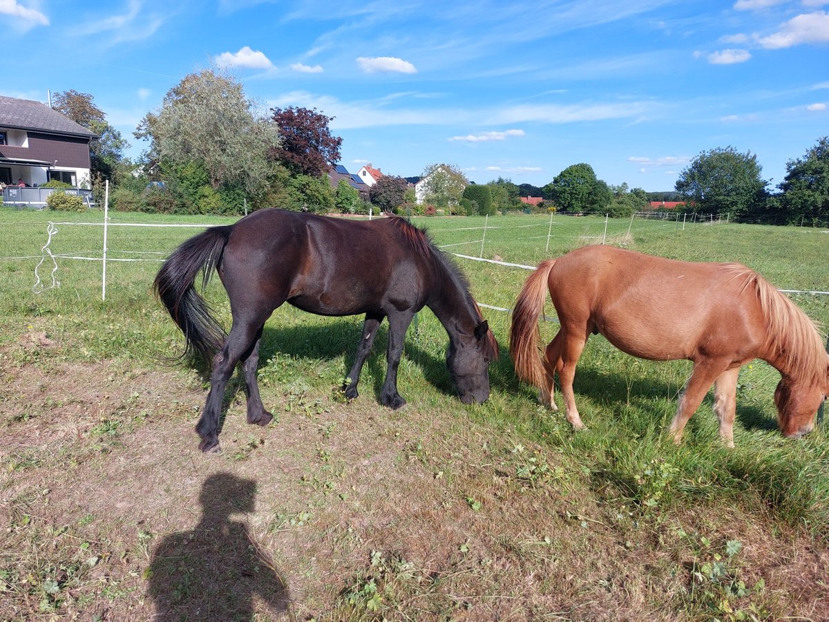 Hekla vom Wiesenhof is a German-bred black 11-year-old 5-gaited mare with an excellent pedigree, a lot of tölt potential, and a very calm character. She is well-developed and strongly built, with a height of around 140 cm, making her ideal for a taller rider. I have only had her for a short time and have not yet been able to ride her confidently in her gaits separately. Due to her absolutely open nature and her friendly, uncomplicated demeanor, she is not only wonderful to handle but also promises to be a fantastic leisure horse for the whole family, with tournament potential with the right training. The previous owners described her as problem-free when leaving the herd and when alone in the field. I can only partially confirm this under my circumstances. However, walks are completely relaxed. Generally, she gives me the impression that she does not get along well with men. She is not familiar with the whip as an aid and reacts rather fearfully to it. However, she loads easily on her own and travels calmly in the trailer. She is very well-behaved when having her hooves trimmed and worked on, is regularly dewormed with us, and is fully vaccinated against tetanus. And very importantly, she is free from eczema. Her hooves have grown flawlessly and are worked on every 6 weeks. The dentist was very satisfied and worked on her in September 2025, with no notable dental issues. Due to her appearance, she would certainly also be an asset for breeding. Her overall health condition can be described as excellent. Heart, lungs, skin, and musculoskeletal system are flawless. Under me, she tends to be restless and has a tendency to run off. The reasons for this are unclear to me and, given my age of 60 and my health limitations, it is now too risky. Thirty years ago, this was not a problem, and I was able to develop a deep bond with my previous horse of the same pattern after just a few months. Therefore, I see Hekla with a woman who has the time and riding space for structured training to provide her a happy horse life with her new person. This is not an urgent sale, and I am giving her the time to find her partner. More information is gladly provided over the phone or on-site. WhatsApp and phone 0152 31975028.
