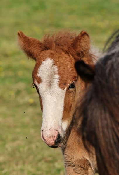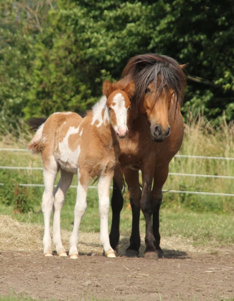 Handsome Aska vom Röttgershof is looking for a loving home! - a beautiful mare born on 17.05.2025 - her color is chestnut pinto, possibly with the roan gene. I'm also completely in love with her beautifully marked blaze! - 5-gaited, she already shows a nice separation of tölt and trot. - sweet character, loves to cuddle but is not pushy. - mother: Meyla von der Haard, a fantastic, well-behaved pony that I ride with much love. - father: Skuggi frá Skeggstödum, a nice character with fantastic gaits! He has just returned home from being backed by Marieke Weber. - both mother and father can be admired at our place. Feel free to send a message for more info, videos, or photos!