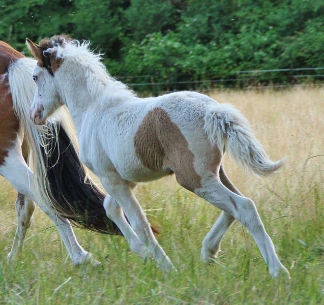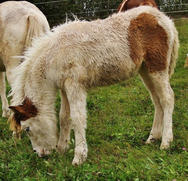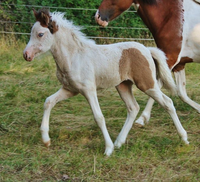 Ich biete hier für kurze Zeit die Gelegenheit eine Farbbombe mit guter Abstammung und schicken Gängen zu Absolutem günstigem Festpreis zu erwerben. Bifröst ist via Test bestätigt Braunfalbschecke mit Splash. Daher ihre aussergewöhnliche Zeichnung die sie überall hervor stechen lässt. Zusätzlich ist sie bei späterem Zuchteinsatz ein Farbgarant da sie reinerbig Schecke ist und daher alle ihre Nachkommen zu 100 % Schecken sein werden. Bifröst ist bei mir geboren, seitdem gesund und regelmäßig entwurmt, Ekzemfrei aus Ekzemfreien Eltern und Großeltern. Sie ist den Mensch gewöhnt und begegnet ihm Unartenfrei, respektvoll, neugierig und freundlich. Ihre Hufe wurden regelmäßig Freistehend geschnitten und auch das Verladen und im Hänger gefahren werden hat sie durch Weideumtrieb positiv kennengelernt. Ihre Vollen Papiere liegen vor, mit Heljar fra Brekknakoti als Opa und väterlich Bekan fra Kolsholti, Glampi fra Vatnsleysu und weitere bekannte gut geprüfte Hengste bringt sie eine ansprechende Abstammung mit. Bifröst zeigt sich Fünfgängig in den ersten Lebensmonaten war der Tölt ihre liebste Gangart bis sie den Trab gefunden hat. Auch Pass wurde Freilaufend schon gesichtet. Aktuell bevorzugt sie meistens ihre guten und sicher vorhandenen Grundgänge. Den Tölt zeigt sie gerne immer noch mindestens in den Übergängen manchmal aber auch Streckenweise. Alle ihre Gänge sind raumgreifend mit gutem Tempo und schöner Haltung. Ihre Mutter ist eine große kräftige Stute und auch ihr Vater bringt ein stabiles elegantes Gebäude mit. Bifröst ist gut entwickelt, aktuell ein großes propperes mädel daher gehe ich davon aus das sie mindestens 140 Endmaß erreichen sollte mit kräftigem etwas elegantem Gebäude. Ich sehe ihre Zukunft in gehobener Freizeit, Zucht und Sport. Wer die süße Maus kennenlernen möchte darf gerne mit Termin vorbei kommen. Sie kann jederzeit in ein neues Zuhause umziegen. Es gibt kein Video und auch nicht die Möglichkeit eins zu machen. Wer wirklich Interesse hat der kommt vorbei und lernt sie persönlich kennen. Wer so wie ich früher ist und auch mal ein Pferd nur anhand von Fotos kaufen möchte dem stehe ich nicht dagegen. Bei echtem Interesse freue ich mich auf Nachricht.