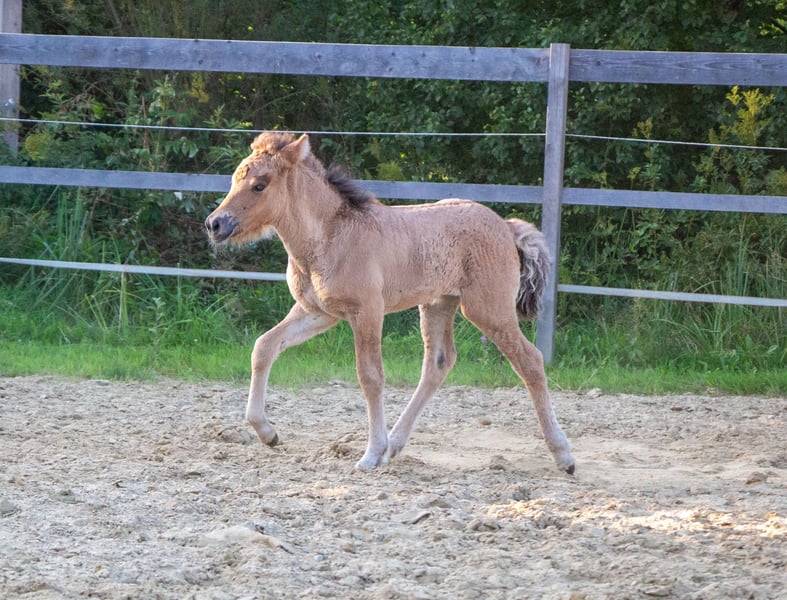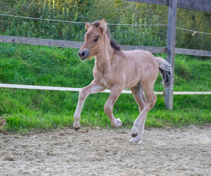 Eydís von Páskadagur *2025 Braunfalbe Eydís ist eine bildschöne, große Absetzerstute. Sie ist 5gängig veranlagt und zeigt seit Tag 1 viel sprudelnden Tölt. Eydís ist ein selbstbewusstes, unerschrockenes Stutfohlen, die mit Präsenz und Austrahlung glänzt. Dem Menschen stets zugewandt. Ihre Mutter Elfa vom Lubberland ist eine Hilmir frá Sauðárkróki Tochter. Sie ist sehr groß und fünfgängig veranlagt. Sie hat ein angenehmes Vorwärts, 5 gleichmäßig verteilten Gänge und unglaublich viel Ausdruck. Elfa ist absolut kopfklar, zuverlässig und unglaublich bequem. Ein Pferd das einfach Spaß macht. Ihr Vater Brilljant frá Efri-Fitjum ist ein gangstarker Junghengst. Er hat spektakuläre Gänge, einen höflichen Charakter, sowie bemerkenswerte Bewegungen. Mit seiner sehr ansprechenden Abstammung, ein Hengst von den man noch hören wird. Eydís ist regelmäßig entwurmt, geimpft, gut mineralisiert, kennt Putzen und das Halfter. Aufzuchtsplatz in der Nähe kann vermittelt werden. Sie kann sofort ausziehen.