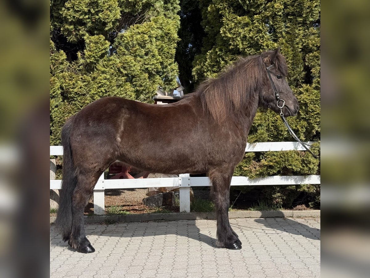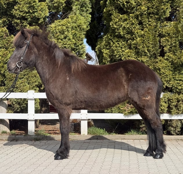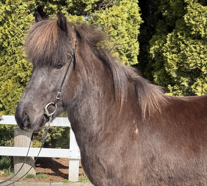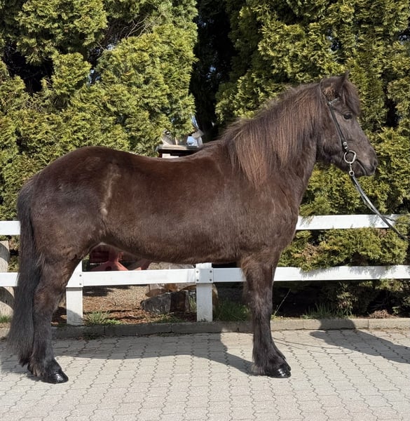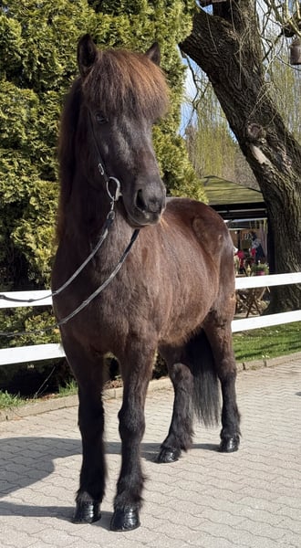 Pamela vom Barghof *2020 in Deutschland Rappe mit Stern viergängig geritten (Pass vorhanden) Stute, 1,42m groß entwurmt, geimpft, beschlagen✅ V: Gígjar frá Auðsholtshjáleigu 8,46 (Ext 7,98 Re 8,78)‼️ VV: Orri frá Þúfu 8,34 (Ext 8,08 Re 8,61)‼️ M: Pandra vom Barghof MV: Óðinn vom Barghof 7,86 (Ext 7,63 Re 8,09) 9,0 für Pass‼️ Pamela ist eine äußerst ansprechende Stute in sportlich-eleganter Optik und eine direkte Tochter des bekannten Gígjar frá Auðsholtshjáleigu. Sie bringt nicht nur ihr gutes Gebäude mit, sondern auch einen einwandfreien Charakter und ganz einfach zu reitende Gänge. Unter dem Sattel zeigt sie gute Mitarbeit, vier klar getrennte Gänge und eine solide Ausbildung. Ihr Tölt ist einfach zu reiten und lässt sich auch von weniger geübten Reitern abrufen. Sie kennt es allein als auch in der Gruppe ins Gelände zu gehen und ist hier eine sichere Begleitung. In neuen Umgebungen oder Situationen gibt sie sich gelassen und eher neugierig. Sollte sie etwas gruselig finden, bleibt sie stehen, schaut sich das „Objekt“ an und macht dann einen Bogen drumherum. Straßenverkehr, Kinderwägen, Hühner, Hunde, Radfahrer kennt sie bereits und nimmt das alles völlig gelassen. Beim Hufschmied, im Anhänger und beim geduscht werden verhält sie sich vorbildlich und macht alles geduldig mit. Dem Reiter gibt sie immer ein sicheres, gutes Gefühl und bringt ihn einfach nur zum lächeln, denn Pamela ist ein absolutes Spaßpferd. Unter dem Sattel ist sie ein echter Hingucker, denn sie weiß sich zu präsentieren und es dabei stets leicht in der Hand. Wir sehen die schöne Stute als tolles Freizeitpferd mit allen Möglichkeiten. Kurse, Wanderreiten, Züchten, Abzeichen und Turniere sind definitiv mit ihr denkbar. Kinder- und Jugendliche die bereits etwas reiten können, können Pamela sofort reiten. Sie kennt Herde und Boxenhaltung. Wer ein Pferd mit einem Herz aus Gold und guten Gängen sucht, wird hier fündig. Wer die schöne Rappstute kennen lernen und probieren möchte, kann dies gerne nach Absprache bei uns in A-5221 Lochen am See tun.