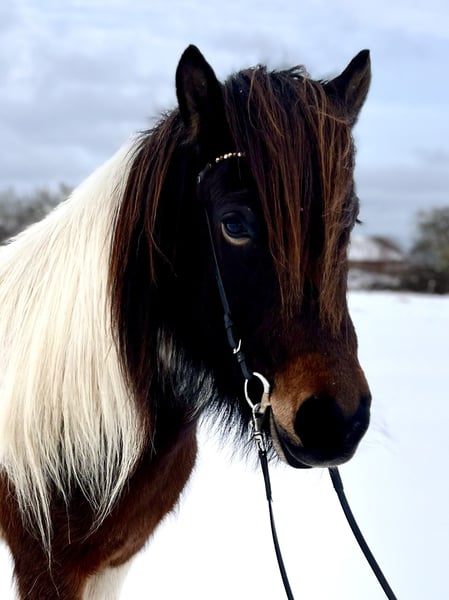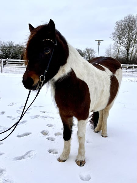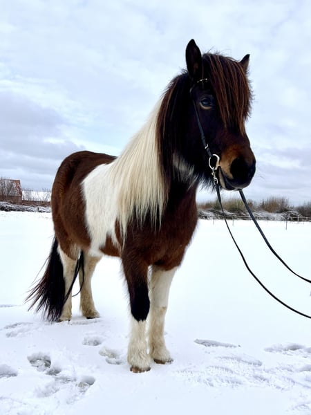 Örvun is an absolute eye-catcher with her long, dense mane, beautiful pinto markings, and feminine expression. As a foal, she was awarded a premium status, and her training was started at nearly five years old. She has been under saddle for two years now and has developed into a versatile leisure horse suitable for many riders. What makes her particularly appealing is that she always works motivated and diligently with her rider, happily participating in all exercises, yet she maintains very balanced gaits that allow the rider to sit comfortably without feeling overwhelmed. If you prefer a horse that doesn't require constant driving but still maintains a steady tempo, Örvun will feel like the perfect match. Örvun is naturally five-gaited, and we ride her in four gaits. She has a consistent gait pattern and an abundance of easy-to-ride tölt. She can töltingly cover long distances in the terrain with minimal rein contact. I often ride her one-handed and take my dog on a leash, which she doesn't mind at all. Her basic gaits are extremely comfortable, providing a pleasant riding experience. She also has a beautiful conformation, is very light in the hand, and responds well to rider cues without being overly sensitive, making her well-suited for dressage riding. She is confident on arena figures, familiar with common exercises, and even knows lateral movements like leg-yield in tölt. In the terrain, she is a reliable partner: she rides absolutely safely even alone in traffic, and in group rides, she remains calm and collected. She doesn’t need to be the leader but can also enjoy excellent rides alone. After a gallop across a stubble field, she remains manageable and does not become overly excited. Additionally, she is familiar with hand and lunging work, including cavaletti, free jumping, and hand-led rides in the terrain. All these activities are enjoyable with her. Örvun is ready for the upcoming season and versatile tasks with her new partner. She is of German breeding, free of eczema, kept in an open stable herd, healthy, fully vaccinated, regularly dewormed, and her teeth have just been checked. No allergies are known, and she tolerates hay, silage, straw, and pasture turnout. She is a straightforward horse to keep with no prior health issues. She comes directly from the breeder, where she was also trained (master operation, IPZV Trainer A).