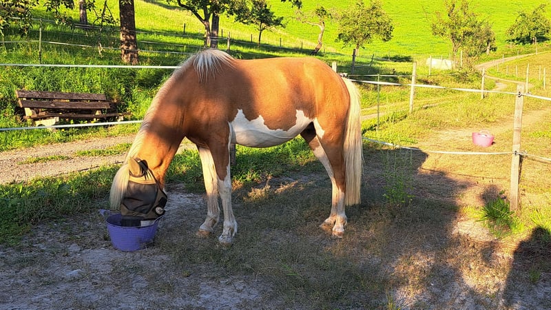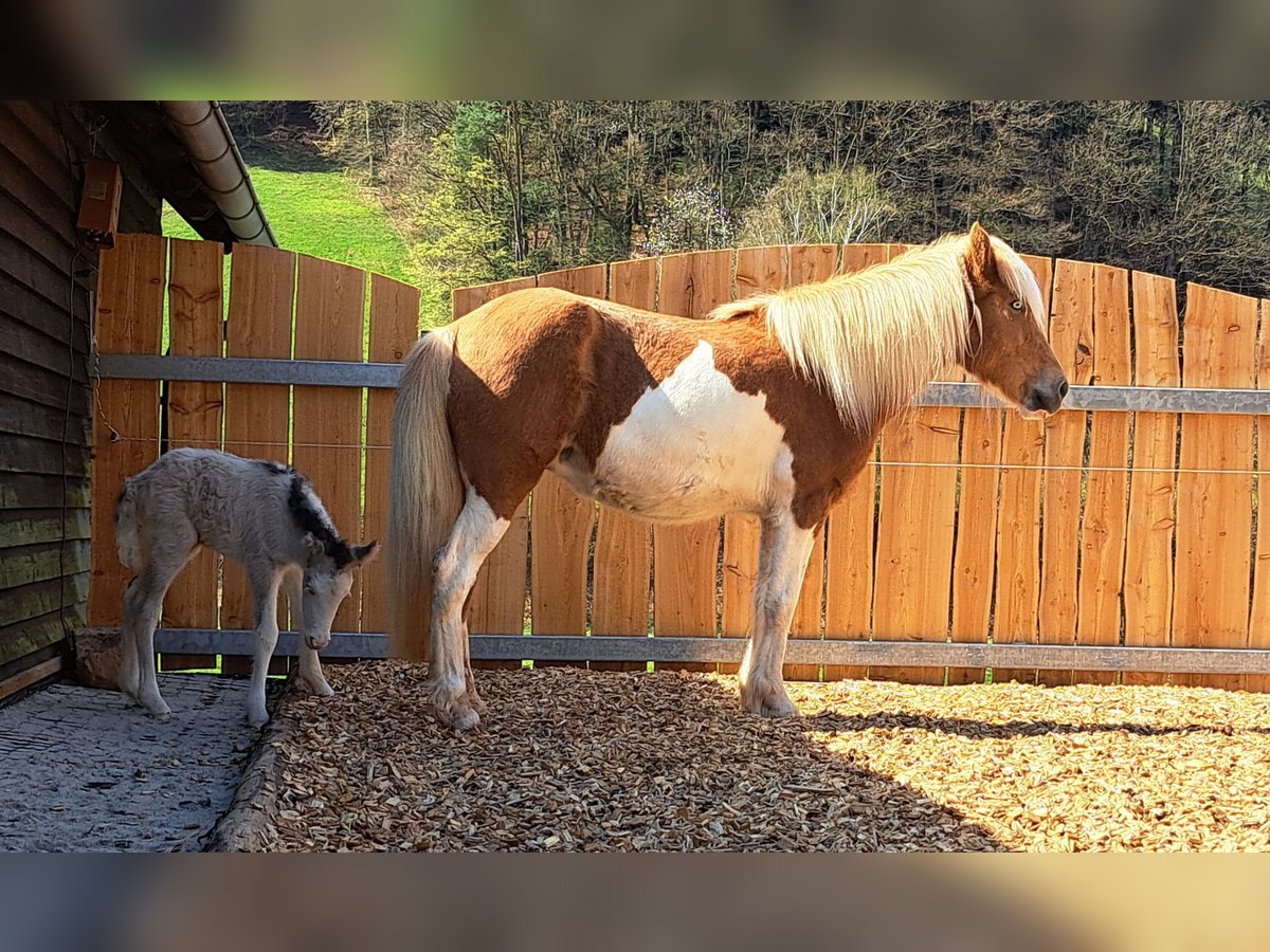 Frökk ist eine eingetragene und gekörte Zuchtstute im Stutbuch 1 und ist ein Fuchs-Helmschecke. Sie hatte insgesamt 3 tolle Fohlen. Ihr letztes Stutfohlen kam im April 2025 zur Welt, eine schicke Graufalbhelmscheckstute mir Creme. Sie ist am 30.05.2018 geboren und wurde schonend Anfang 2025 von mir angeritten. Sie geht super brav alleine ins Gelände und ist auch sehr unerschrocken. Wanderer, Hunde, Flatterband oder Waldmaschienen sind für sie kein Problem. Momentan läuft sie noch gebisslos am Kappzaum und das super fein. Die Gewöhnung ans Gebiss habe ich jetzt begonnen, ist aber ganz unspektakulär. Sie macht super arbeitswillig in der Bodenarbeit mit. Sie kennt Longieren, Equikinetik, Stangenarbeit, Freiarbeit. In der Handarbeit kennt sie Schulterherein, Schenkelweichen und übertretende Volten. Sie kann auch sehr gut Schenkelweichen auf einen zu, was ich gerne zum Aufsteigen nutze. Paar kleine Tricks kann sie auch. Als Handpferd läuft sie sehr gut mit. Sie hat einen angenehmen flotten Schritt und einen tollen ausdrucksstarken Trab mit viel Aktion. Tölt ist unter dem Sattel gut abrufbar, sie braucht da generell noch mehr Kondition und Kraft Sie steht bei mir im Offenstall und ist sehr sozial und verträglich. Im Winter bekommt sie all you can eat Heu und im Sommer steht sie 24h auf der Wiese. Sie wurde regelmäßig geimpft, entwurmt und die Hufe gemacht. Sie läuft hier sehr gut barfuß. PSSM/MIM negativ Zähne erst frisch gemacht. Sie wird vermehrt von mir vom Boden gearbeitet, da ich das Gefühl habe ich wäre zu groß und zu schwer für sie. Ich suche für sie ein schönes Zuhause, wo sie im Mittelpunkt stehen kann und vielleicht vielseitig ausgebildet werden kann. Sie ist bei mir sehr gesprächig und begrüßt einen immer. Frökk ist eine ganz liebe, sensible Stute, trotzdem noch ein Jungpferd. Du solltest dich mit der feinen Hilfengebung auskennen, da ich meine Pferde sehr fein und leise ausbilde. Wenn sie dir das Interesse geweckt hat melde dich gerne, auch gerne per Whats App 015757999782