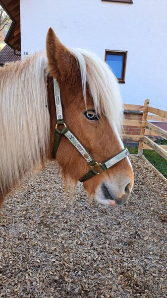 Frökk is a registered and licensed broodmare in Studbook 1, with a chestnut and flaxen mane and tail. She has produced a total of three wonderful foals. Her latest foal, born in April 2025, is a stylish grey filly with a flaxen mane and tail, sired by Creme. She was born on May 30, 2018, and was gently backed at the beginning of 2025. She is very well-behaved alone in the terrain and is also quite fearless. Hikers, dogs, flutter tapes, or forest machinery are no problem for her. Currently, she is ridden bitless with a sidepull and goes very softly. I have recently started introducing her to the bit, but it’s very unobtrusive. She shows great willingness to work in groundwork exercises. She is familiar with lunging, equicinetics, pole work, and free jumping. In-hand, she knows shoulder-in, leg-yield, and overbending circles. She also performs very well with leg-yielding on a turn, which I often use for mounting. She can also do a few tricks. As a lead horse, she works very reliably. She has a pleasant, lively walk and a beautiful, expressive trot with lots of action. The tölt is easily accessible under saddle, although she generally needs more conditioning and strength in this gait. She is kept in an open stable with me and is very social and compatible. In winter, she receives unlimited hay, and in summer, she is on pasture 24/7. Her vaccinations, deworming, and hoof care are up to date. She is barefoot and moves very well without shoes here. PSSM/MIM negative. Her teeth have just been recently floated. Most of her training with me is ground work, as I feel I am too large and heavy for her to carry comfortably under saddle. I am looking for a nice home where she can be the center of attention and perhaps be trained in a versatile way. She is very communicative with me and always greets warmly. Frökk is a very sweet, sensitive mare, but still a young horse. You should be familiar with fine aids, as I train my horses very subtly and quietly. If you are interested, please feel free to contact me, also via WhatsApp at 015757999782.