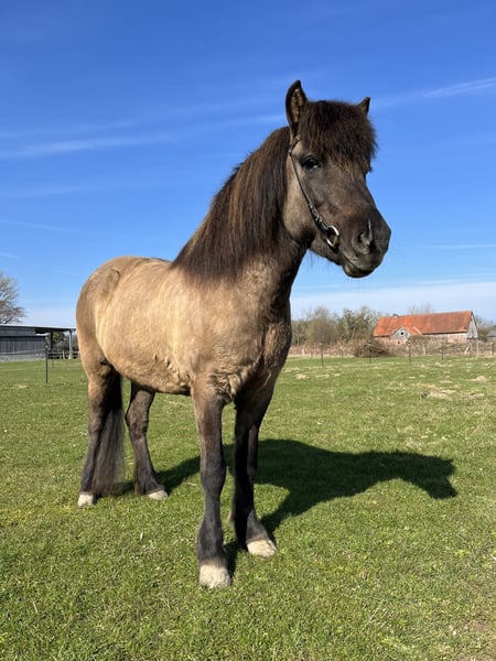 Andrá ist eine kompakte und kräftig gebaute Fünfgangstute, die definitiv im alten Typ steht und ihren Reiter sehr gut abdeckt. Sie ist die Vollschwester unserer Stammstute Ásta und die Tochter meines Lieblingspferdes Áfram. Diese Linie zeichnet sich durch Zuverlässigkeit, Nervenstärke und optimale Reiteigenschaften als Freizeitpferd aus. So tritt auch Ándrá als letztes Fohlen von Áfram in die Fußstapfen dieser Familie. Sie ist ein leichtrittiges Pferd, das angenehm und eher fein auf reiterliche Einwirkung reagiert. Sie hat ein gut mittleres Temperament und Freude am Laufen und Arbeiten, so dass man sie nicht treiben muss. Dabei sind ihre Gänge sehr schön zu sitzen, für ein Freizeitpferd optimal. Wie alle unsere Pferde wurde auch sie liebevoll, fachgerecht und vielseitig ausgebildet. Sie hat eine gute Gangtrennung und ganz viel natürliche Töltveranlagung. Derzeit trabt und töltet sie gleichermaßen gern. Der Trab ist fleißig, mit gutem Takt und gut zu sitzen. Der Tölt ist einfach zu reiten, wobei es manchmal einen Moment braucht, bis sie sich taktklar eingelaufen hat. Der Galopp ist eher flach und gelaufen, aber sie kann auf der Bahn und auch auf auf dem Zirkel galoppieren, aber auch im Gelände fleißig sein, wenn man Spaß daran hat. Dort ist sie sehr unerschrocken und sicher im Straßenverkehr und lässt sich super alleine ausreiten, aber auch in der Gruppe macht sie Spaß. Sie lässt sich auch dressurmäßig arbeiten und ist immer motiviert dabei, wobei ihre große Stärke das Geländereiten ist. Für einen Reiter, der Freude an längeren Ausritten oder sogar Wanderritten hat, wäre sie optimal. Natürlich lässt sie sich auch longieren und geht super als Handpferd mit. Wer ein fröhliches Pferd mit einer guten Arbeitseinstellung als Freizeitpferd sucht, ist bei Andrá genau richtig! Sie ist deutsch gezogen und ekzemfrei, wird im Offenstall mit anderen Pferden gehalten und verträgt Heu, Stroh, Silage und Weidegang.