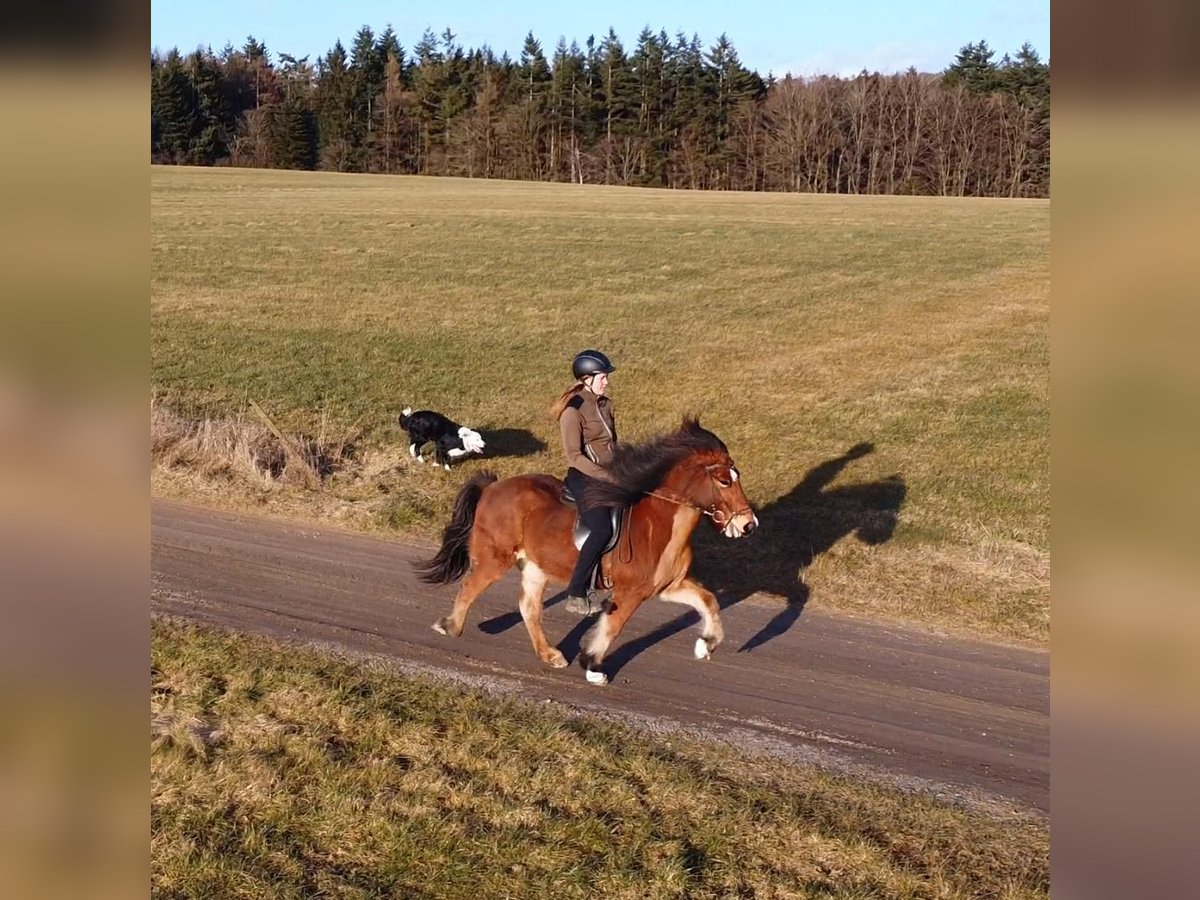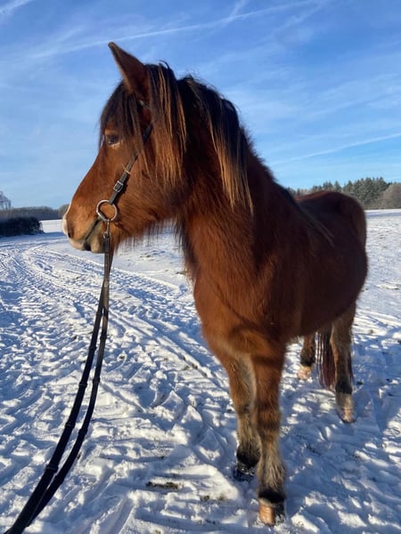 Skráning is a very beautiful 9-year-old five-gaited mare with a star and snip, who provides a lot of riding enjoyment. Her favorite gait is the Tölt, which features expressive movement and is always reliably available in both slow and fast tempos. Last year, she gained her first competition experience, demonstrating potential in Tölt and Pass tests. Her flying pace is currently being further trained, and she has successfully been used as a Pass horse in the IPZV-RA 3. Her temperament is very sweet, with a wonderful presence. Skráning is accustomed to large machinery, cyclists, and has also participated in a few trail rides, where she proved to be a confident and brave riding horse. In 2023, Skráning had a foal, which is developing very well and is also on the farm. She is regularly dewormed, vaccinated, and has been free of eczema since her import in 2021.