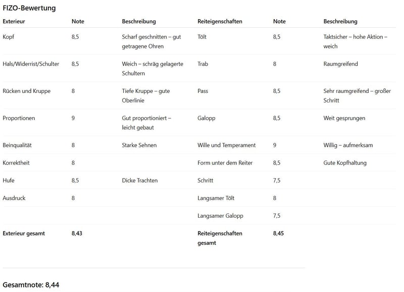 Krummi frá Tjarnastöðum (*2012) ist ein beeindruckender, eleganter Hengst mit einem Stockmaß von 1,45 m und einer Gesamt-FIZO-Bewertung von 8,44. Seine Reiteigenschaften wurden mit 8,45 bewertet, wobei er in den Gangarten Tölt, Pass und Galopp sowie in der Form unter dem Reiter jeweils eine 8,5 erhielt. Besonders hervorzuheben sind seine 9,0 für Charakter und Gehwille. Auch im Exterieur überzeugt er mit einer Gesamtnote von 8,43, darunter 8,5 für Kopf, Hals-Widerrist-Schulterpartie und Hufe sowie eine 9,0 für seine Proportionen.