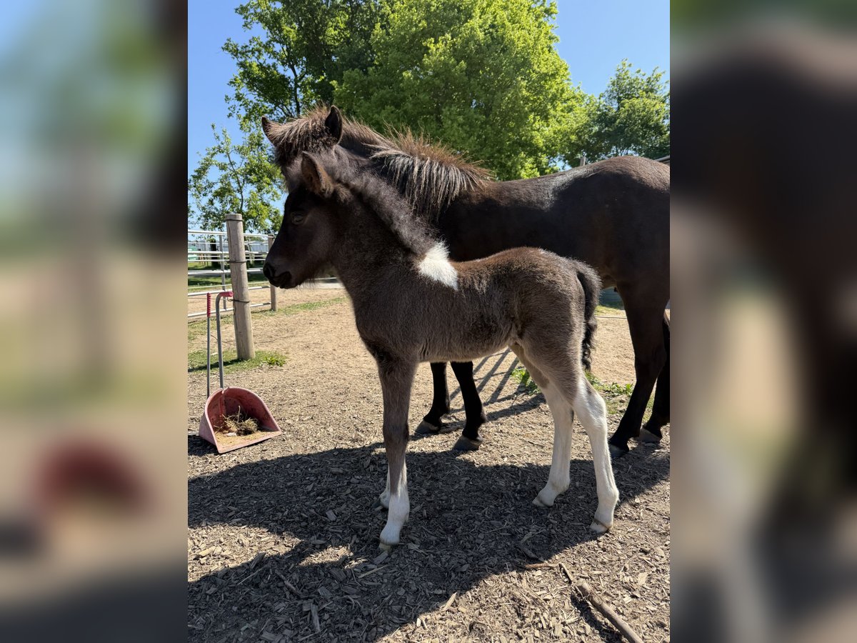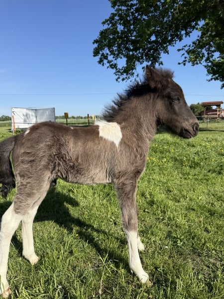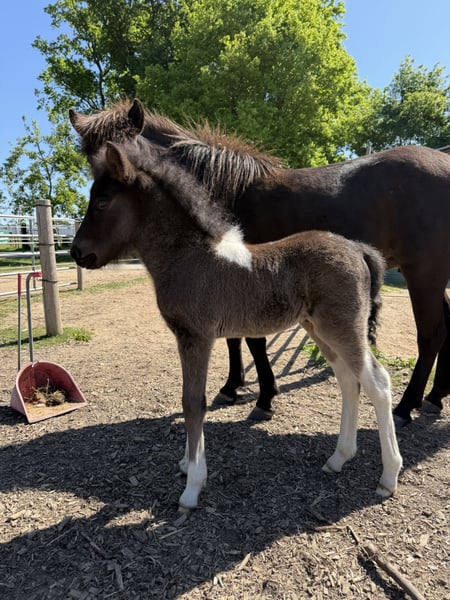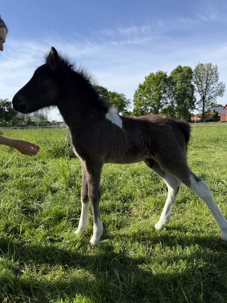 Skjóni vom Skógahof (*2025) Black pinto with a star and blue flecks in the eye Sire: Glæsir frá Hjardarholti (8.12 Young Horse FEIF) SS: Isak frá Bjorsabakka (8.61 as a four-gaited horse, 8.84 for conformation) Dam: Stjarna vom Skógahof (8.0 Young Horse FEIF) DS: Máni frá Hrafnkelsstödum (FIZO all gaits 8.0) Skjóni was born on April 30, 2025, and demonstrates a lot of speed variance and flow in all gaits. He is very people-oriented and not at all skittish. When free-running, he shows all gaits, especially a lot of tölt and a very secure and fast pace! He promises to be a great stallion candidate for leisure riding, as he is completely unflappable and relaxed (like his mother), with potential for competitions. Both parents have very long and thick manes. Anyone looking for a sweet, relaxed stallion with power will find exactly what they need in Skjóni. He can also stay with us for upbringing. The last pictures show his parents. Location: 49832 Thuine