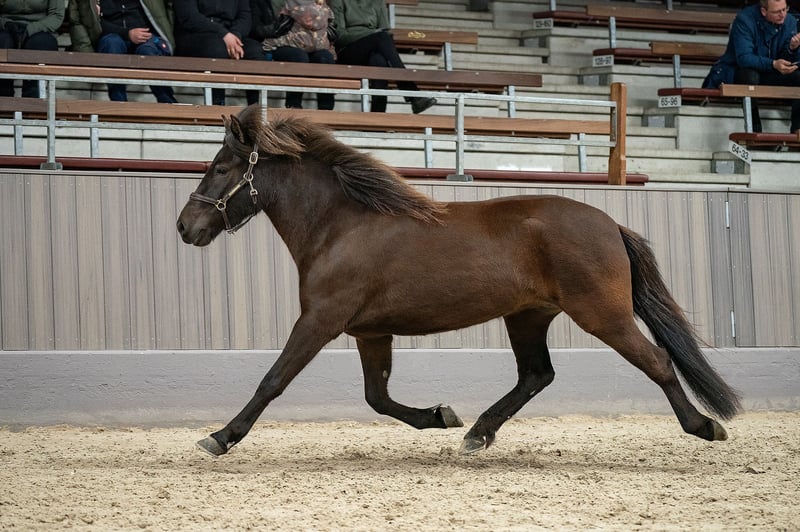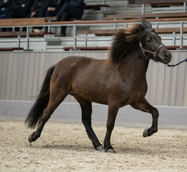 Skjóni vom Skógahof (*2025) Czarny srokaty z gwiazdką i niebieskimi plamkami w oku O: Glæsir frá Hjardarholti (8,12 w klasie młodych koni - FEIF) OO: Isak frá Bjorsabakka (8,61 jako czterogangowiec, 8,84 za budowę) M: Stjarna vom Skógahof (8,0 w klasie młodych koni - FEIF) OM: Máni frá Hrafnkelsstödum (FIZO wszystkie chody 8,0) Skjóni urodził się 30.04.2025 i prezentuje się z dużą zmiennością tempa i płynnością we wszystkich chodach. Jest bardzo towarzyski i wcale nie bojaźliwy. Na swobodnym wybiegu pokazuje wszystkie chody, a zwłaszcza dużo tölta i bardzo pewny oraz szybki pas! Obiecuje być świetnym kandydatem na ogiera do rekreacji, ponieważ jest całkowicie nieustraszony i zrelaksowany (jak jego mama), z potencjałem na zawody. Oboje rodzice mają bardzo długą i gęstą grzywę. Kto szuka kochanego, zrelaksowanego ogiera z mocą, ten znajdzie w Skjóni idealnego konia. Może również pozostać u nas na wychowanie. Ostatnie zdjęcia przedstawiają jego rodziców. Lokalizacja: 49832 Thuine