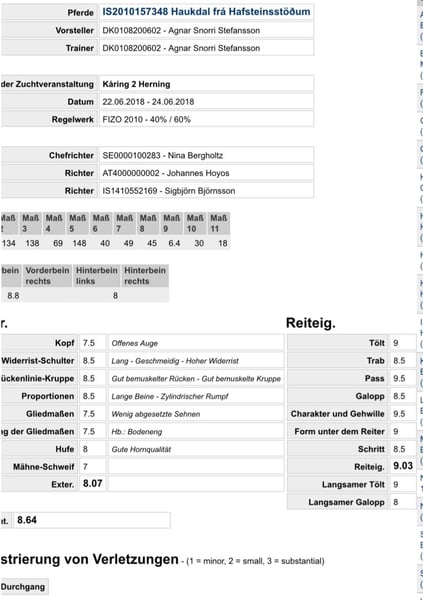 Father: Haukdal from Hafsteinsstödum, score: 8.64 Mother: Lina from der Elschenau, score: 8.12
