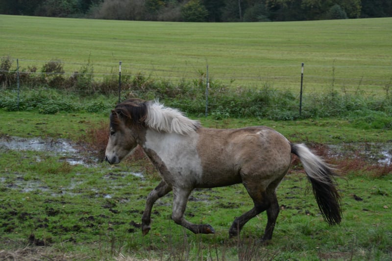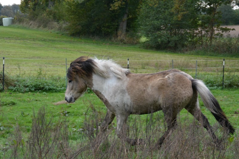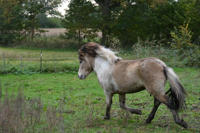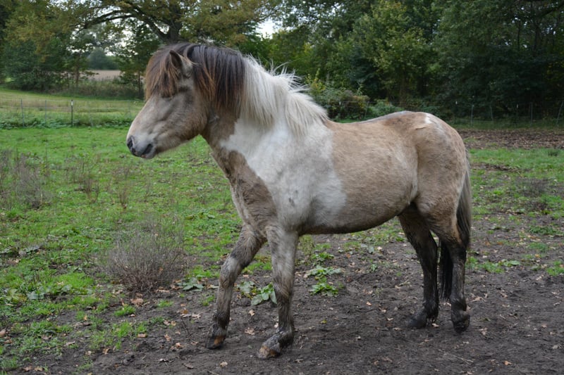 Hjalti po Seimur, przyciąga wzrok, jego umaszczenie to Braunisabell - Sabino. To zrównoważony, dobroduszny młody ogier, który chętnie się uczy. Dobrze dogaduje się ze wszystkimi i, podobnie jak jego koledzy, stoi obok młodych klaczy na dużym pastwisku dla ogierów w wieku od 1 do 4 lat. Hjalti jest synem ogiera Hekja po Seimur (Tobiano) i dobrze znanego ogiera Krjarkur po Seimur, gniadego. Może być prezentowany jako 3-latek i byłby świetnym ogierem hodowlanym, ale nadaje się również do sportu i rekreacji. Bardzo dobrze chodzi na halterze obok ciebie. Jest 5 i osiągnie ostateczną wysokość około 1,44 metra. Jeśli wzbudziliśmy Twoje zainteresowanie, odwiedź nas lub wyślij nam wiadomość.