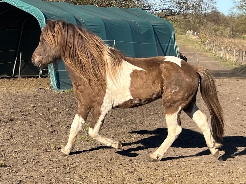 Neisti, son of the elite mare Njala by Seimur & Salómon frá Rödli. He is something very special and should, if possible, be presented as a 5 year old ridden by Fizo. He is an elegant, sporty young stallion with lots of movement. He has 5 gaits, whereby the tölt stands out in particular. He is currently standing in our large pastures with the young stallions aged 1-4 and can be viewed at any time. He will reach a final height of approximately 1.44 m. He is also the grandson of Kjarkur by Seimur. His character and nature are very friendly, he is very sociable with everyone and should be worked from spring 2025. His color is brown pinto, his coat is also not without! The young stallions are with us, next to the young mares. He can be used as a breeding stallion, but also for sport and leisure! More details via PN.