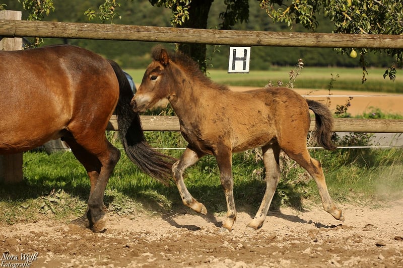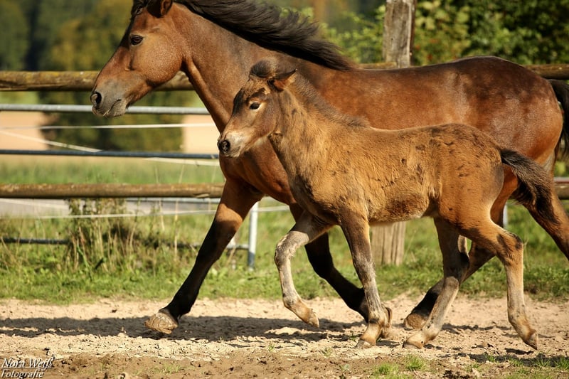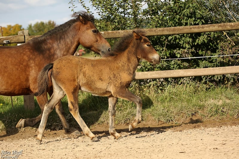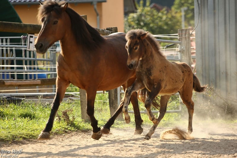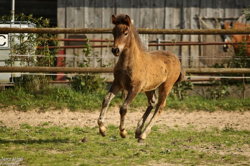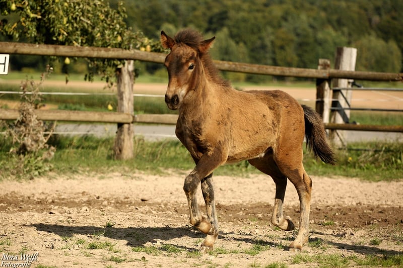 Bjarki vom Grafenbuch *18.07.2025 V: Eyður fra Hálakoti VV: Álfasteinn frá Selfossi (Ehrenpreis für Nachkommen) VMV: Oddur frá Selfossi (1 Preis für Nachkommen/ Ehrenpreis für Nachkommen) M: Brynja frá Ey1 MV: Visir frá Sydri-Gjöf (WM Teilnehmer) MVV: Keilir frá Midsitju (1 Preis für Nachkommen/ Ehrenpreis für Nachkommen) Unser Gute-Laune-Bär Bjarki ist bereit mit seinem Menschen richtig tolle Abenteuer zu erleben! Bjarki ist einfach ein toller Kerl! Er ist super keck und aufgeweckt, ganz mutig geht er in jede Situation und trotz seines noch jungen Alters lässt er sich von den älteren Fohlen nicht die Butter vom Brot nehmen. Er hat bereits jetzt schon einfach eine unglaubliche Präsenz, fällt im Paddock sofort ins Auge und hat einfach Spaß am Leben! Seine breite Brust und kräftige Hinterhand verleihen ihm nicht nur ein richtig knuffiges Aussehen sondern auch viel Kraft. Zur Zeit zeigt er sich deutlich Fünf-Gang veranlagt mit extrem starkerm Tölt. Traben kann er auch, bevorzugt aber fast immer den Tölt. Ein gut aufwärts gesprunger Galopp sowie klare Rennpassveranlagung gehören ebenfalls zu seinem ganglichen Repertoire. Bjarkis Vater Eyður fra Halakoti ist ein sehr großer (1,46m) hoch geprüfter (Gesamt 8,15) Sohn des legendären Álfasteinn frá Selfossi. Eyður ist zudem charakterlich ein wahrer Schatz! Absolut anständig, ohne Hengstmanieren, super leistungsbereit und immer angenehm zu reiten. Besonders sein super leicht zu reitender Tölt den man problemlos bis ins ganz hohe Tempo reiten kann hat mich beim Proberitt begeistert. Auch im Sport hat Eyður sich mehrfach bewiesen. Bjarkis Mutter Brynja ist mein persönliches Lieblingsreitpferd, sie ist eine sehr kräftige große Fünfgangstute mit gutem Tölt und Galopp. Sie hat einen ganz freundlichen, sanften Charakter. Unterm Sattel ist sie sehr temperamentvoll und strebsam dabei immer in gutem, feinen Kontakt mit dem Reiter und bemüht zu gefallen. Ich sehe Bjarki später ebenfalls als sehr vielseitiges Luxus Freizeitpferd mit dem man sicher auch auf dem ein oder anderen Turnier gut aussieht. Auch als Jugendsportpferd könnte ich ihn mir gut vorstellen. Bjarki ist komplett fit, er und seine Mutter bekommen beste Versorgung und werden in einer großen Herde mit weiteren Fohlen auf weitläufigen Weiden oder im Offenstall gehalten. Bjarki wird bereits als Fohlen alle Dinge des täglichen Lebens lernen und mehrfach Hänger fahren (Weideumzug) und selbstverständlich gründlich entwurmt und gepflegt werden. Zusätzlich wäre es möglich einen Aufzuchtplatz in unserer Junghengstgruppe für ihn zu erhalten.