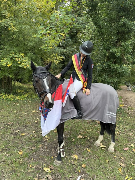 Da meine Ponyzeit nach diesem Jahr endet, suche ich für Mr. Magic Jimmy B ein neues Zuhause. Magic ist ein 10-jähriges irisches Sportpony (148 cm eingemessen), das besonders im Springen begeistert. Er hat Siege und Platzierungen bis L-Springen gegen Großpferde gesammelt und dort regelmäßig tolle Noten bis in den 8er-Bereich bekommen. Erste Starts in M-Springen hat er bereits absolviert. Dressur beherrscht er bis Klasse L, aber am glücklichsten ist er eindeutig im Parcours. Ich kenne Magic schon seit 2020 und durfte ihn regelmäßig reiten. Im September 2023 haben wir ihn schließlich gekauft. Gemeinsam haben wir im Springreiterwettbewerb angefangen und uns bis in die Klasse M hochgearbeitet. Magic gibt immer sein Bestes und ist dabei ein verlässlicher Partner, der Fehler verzeiht und mir viel Sicherheit vermittelt hat. Wir wurden dieses Jahr dritter auf der Landesmeisterschaft und zum Abschluss Süddeutscher Meister mit der Mannschaft. Da hatte er das insgesamt zweitbeste Ergebnis. Zudem sind wir seit 2023 festes Mitglied des hessischen Kaders gewesen. Im täglichen Umgang ist er total unkompliziert: brav beim Tierarzt, Hufschmied und Zahnarzt, verladefromm und problemlos im Hänger oder Transporter. Einwandfreie aktuelle Röntgenbilder der Beine liegen vor. Alle Impfungen nach LPO, inklusive Herpes, sind selbstverständlich gemacht. Ich wünsche mir für Magic ein ambitioniertes Kind im E/A-Bereich, das ein ehrliches und leistungsbereites Sportpony sucht, mit dem man gemeinsam wachsen kann – so wie ich es durfte.