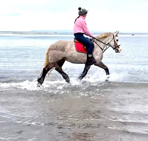 Heather is currently a 15.9 hh Irish Draught mare. She is expected to grow a bit more. As is typical for her breed, she has a solid foundation and is well-suited for larger riders. Heather is robust and versatile in her use. She came directly from her breeder to us. Last year, she was gently backed and has only been ridden in the countryside. As seen in the photos, she comes straight from the coast and was regularly ridden along the sea. :-) Since arriving with us, Heather has been trained in dressage in an indoor arena. She has three good, solid gaits and is easy to sit. Contrary to what one might expect, Heather is very light on the aids. Her character is truly exceptional—she is such a sweet and uncomplicated mare. Heather is truly charming; Irish Draughts are simply such cool and resilient horses. We are continually impressed. Heather is an all-rounder, and yes, she also jumps well. ;-) For more information, we look forward to your call at: 0177/2721831. If you're interested in videos, please contact us directly via WhatsApp. :-)