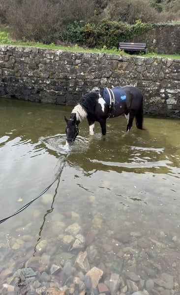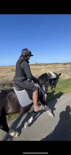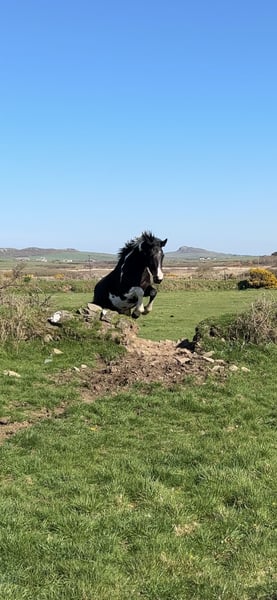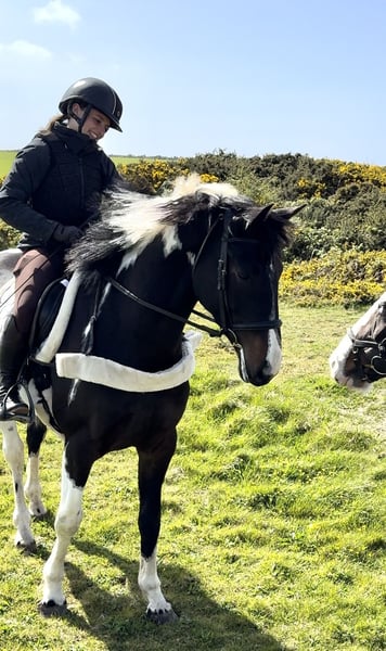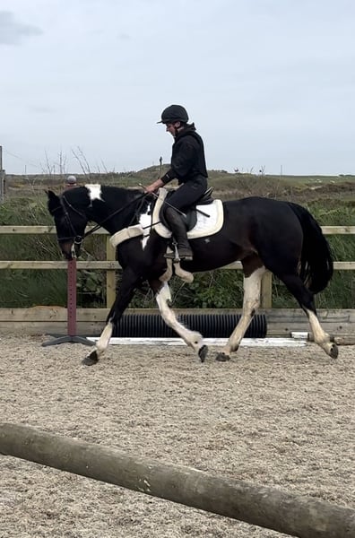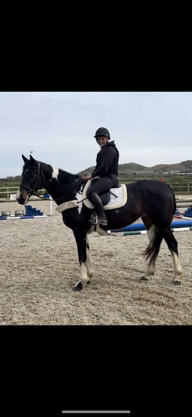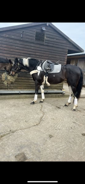 Absolutely divine 16.3hh 4yo Piebald Mare. By Russian Monarch / Glenhill Gold out of a Colin Diamond mare. A truly special young mare with all the attributes to make a top-class allrounder or competition prospect. She is such a quality mare and has the kindest temperament you could wish for. She has been lightly and correctly started, and showed maturity beyond her years. I feel incredibly safe on board. She was backed and turned away for a little 10 week holiday. She has since come back into work, she’s hacked alone and in company. Been on a group ride away from home. Worked in the school lightly in walk, trot and canter and loose jumped over some XC fences. She has natural balanced paces for a bigger horse, and has showed a lot of jump ability. I can’t emphasise how honest, bold and straightforward she is. She has such a lovely attitude and is so incredibly level headed with everything asked of her. She has the brain and temperament to suit an amateur rider but the quality to progress further in the right hands too. Her temperament is second to none — genuinely one of the kindest, easiest mares you will ever meet. She is mannerly on the ground, willing under saddle, and just a pleasure to own. Only available due to personal circumstances — this mare is my absolute dream horse and this is a genuinely gutting decision.