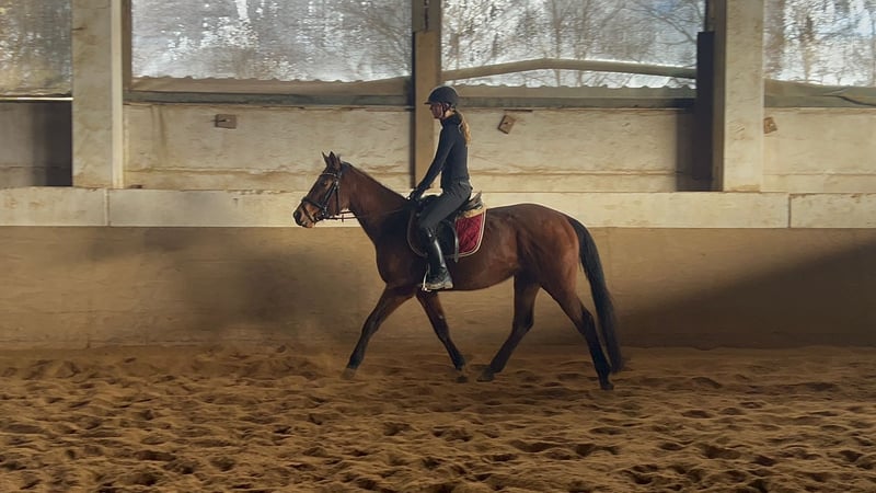 Keira is a very gentle, refined mare that is currently with us for training and will be available for sale. She is a one-person horse, enjoys the company of children, and gets along well in a mixed herd. We have introduced her calmly and gradually to saddle training, and she now rides in all three basic gaits. Due to weather conditions, she has so far only been ridden indoors. Keira is NOT suitable for beginners and is not recommended for nervous riders. She does not tolerate rider errors well. She requires a calm, sensitive, and confident rider. If you would like to get to know her, please contact us via WhatsApp or call us at 01639129382.