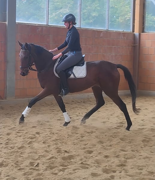 Well-bred 4-year-old mare, approximately 168 cm tall. Reasonably and carefully started under saddle. Very eager to learn. Equipped with sufficient potential for both dressage and jumping. Clear-headed and willing to learn. Ideal for further training over the winter and to make a strong start in the new competition season. Also very interesting for further marketing. Despite her young age, she is already very well-behaved at work. Trade-ins and transport are possible. If needed, she can be sold with a complete new set of equipment for a small additional fee. A veterinary pre-purchase examination can also be conducted by your own veterinarian, including X-rays and blood tests. We look forward to your call at 01774289729. Written inquiries will not be answered. We believe that anyone interested in a horse should call. Those who wish to refrain from sending pointless emails should avoid contacting us.