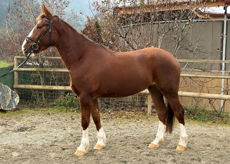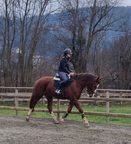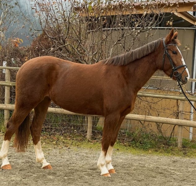 For sale is an exceptionally beautiful and talented Irish sport horse mare (born in 2021), impressing both with her striking appearance and her consistently pleasant temperament. She is large-framed, correctly built, and currently measures 17.5 hh, presenting a modern, athletic conformation. 🐴 Appearance: - Stunning dark chestnut - Attractive blaze - Four white socks - Very harmonious and elegant overall impression ✨ Character & Handling: This mare captivates with an extremely calm, friendly, and people-oriented nature. She is utterly lovable, shows no bad habits, and is absolutely straightforward in daily handling. - Well-behaved under saddle - Nerve-proof and clear-minded - Easy to handle, suitable even for less experienced riders - Quiet at the blacksmith - Loadable without issues 🏇 Training & Potential: The mare has been gently and age-appropriately trained and consistently demonstrates motivation and ease of riding under saddle. Dressage: Level A, smooth, supple gaits, very comfortable to sit Show jumping: Has jumped up to 1.00 m, always forward, not spooky, reliable to get to the other side Cross-country: Familiar with obstacles and hunting fences, a dependable partner in the field She possesses talent and aptitude for all equestrian disciplines and, with further training, is sure to develop into a top sport partner. Due to her wonderful character, she is also ideal for ambitious leisure riders who enjoy a particularly pleasant horse. 💉 Health: - Healthy, no vices - Shod on all four feet - Regularly vaccinated and dewormed 📦 Accessories & Service: - Suitable tack can be purchased at an additional cost - Transport can be arranged if needed 📍 Viewing & Contact: A viewing appointment can be arranged at any time by prior arrangement. For further information, pictures, or videos, please feel free to contact us at any time.