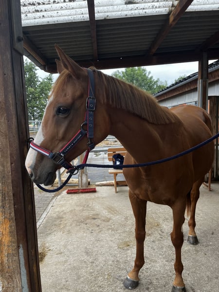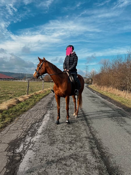 Huhu Ich suche für meine 7-jährige Irish Sporthorse Stute Ruby (ca.1,60) ein neues, liebevolles Zuhause. Ich habe sie seit etwa einem Jahr, muss mich jedoch aufgrund von finanzieller und privater Gründe schweren Herzens von ihr trennen. Ruby hat einen wundervollen Charakter, ist sehr lernwillig, mutig und aufmerksam. Sie bringt ordentlich Go mit und liebt es, sich zu bewegen und zu arbeiten. Sie wünscht sich eine feste Bezugsperson, zu der sie Vertrauen aufbauen kann – hat sie dieses Vertrauen einmal, ist sie sehr anhänglich und macht unglaublich viel Spaß in der täglichen Arbeit. Ruby kennt: • Longieren & Doppellonge • Arbeit am Kappzaum & Knotenhalfter • Stangenarbeit & Bodenarbeit • Gelände Sie ist lieb beim Schmied, brav beim Verladen und stand bereits mehrere Stunden ruhig im Anhänger. Reiterlich ist Ruby als angeritten einzuschätzen. Wir waren viel im Gelände unterwegs und arbeiten aktuell an ihrer Grundausbildung auf dem Platz. Sie reagiert sehr fein auf Hilfen und Stimme und benötigt keinen starken Druck. Wir haben bisher eine einfühlsame Trainerin an unserer Seite gehabt. Ruby ist kein Anfänger- oder Kinderpferd. Sie benötigt einen erfahrenen Reiter, der sie ruhig und konsequent weiter fördert und Freude an ihrer Ausbildung hat. Gesundheit • aktuell Umstellung auf Barhuf • sie lief zuvor mit Eisen, kommt aber auch ohne gut zurecht • bisher keine Tierarztbehandlungen notwendig • Zähne gemacht & Impfung: Januar 2025 • regelmäßig entwurmt Aufgrund der Barhuf-Umstellung wird sie unter Wert abgegeben. Es ist sehr viel Zubehör vorhanden, u. a.: • Sattel • Trense • Schabracken • Decken • Gamaschen Zubehör kann teilweise miterworben werden. Reitvideos sind vorhanden. Ruby wird nur in gute Hände abgegeben. Bei ernsthaftem Interesse freue ich mich über eine Nachricht mit kurzer Vorstellung. Liebe Grüße Mia & Ruby