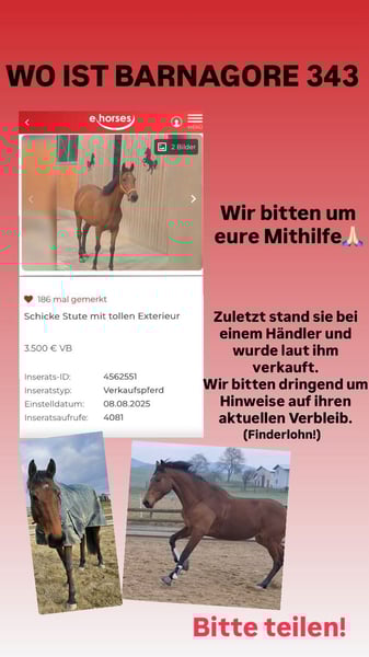 Barnagore 343 ist 8 Jahre alt und stand zuletzt bei einem Händler. Laut dem Händler ist sie bereits verkauft. Wir suchen nach ihr und bitten dringend nach Hinweisen zu ihrem aktuellen Verbleib.