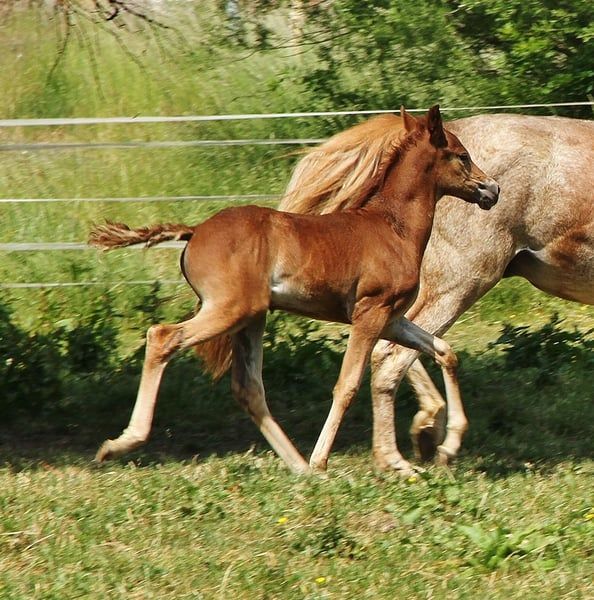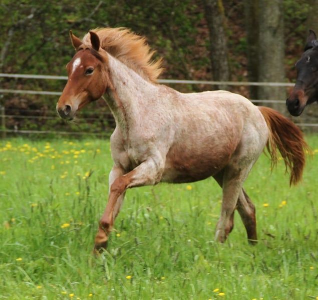 Love ist ein Speed Racking Horse - eine noch selten hier in Deutschland vertretene Gangpferderasse aus den USA die aber immer mehr an Beliebtheit gewinnt. Ein großes Gangpferd das je nach späterer Ausbildung über Rack bis ins hohe Tempo verfügen kann und damit zu den schnellsten Töltern gehört, dabei aber in der Regel vom Kopf her immer klar und regulierbar bleibt . Rack ist gleichzusetzen mit dem Tölt . In den USA werden sie gerne auf Speed Rack Rennen und auf gerittenen Show Gang Turnieren eingesetzt. Bei uns finden sie immer mehr Anhänger im Bereich Freizeit, Wanderreiten und Distanz aber auch auf Gangpferdeturnieren werden sie immer öffter erfolgreich vorgestellt. Wie z.B. auf der Internationalen Deutschen Meisterschaft im Gangreiten die 2025 im August stattgefunden hatte. Wem der Isländer zu klein ist er aber das Töltfeeling nicht missen möchte hat mit dem Speed Racking Horse einen vergleichbar vielseitigen Allrounder zur Option. Love ist 2023 bei mir geboren, sie überzeugt durch ihren netten höflichen lieben Charakter. Von Fohlen an wächst sie artgerecht, robust und gut sozialisiert in alters und Rasse gemischter Herdenhaltung auf. Sie kennt keine Boxen- oder Einzelhaltung und wird auch nicht in eine solche Haltungsform abgegeben. Wird regelmäßig Entwurmt und Hufe gepflegt. Ist geimpft gegen Tet. und Infl. Ekzemfrei Gesund und unverletzt Hufpflege- und Verladefromm Aktuell ca. 153 Stm groß und sollte ein Endmaß um die 158 Stm erreichen können, denn mit ihren knapp 2,5 Jahren ist ihre Entwicklung noch nicht fertig. Love gehört zu den wenigen Speedys die auch über Pass verfügen. Sie ist also Fünfgangveranlagt. Dabei dominieren ihre gut ausgeprägten sicher vorhandenen Grundgänge. Als Fohlen hatte sie auch vermehrt Pass und Tölt gezeigt. Aktuell sieht man den Tölt mindestens im Übergang, da sie aktuell den Trab bevorzugt. Sie hat entsprechend ihrer Rasse etwas mehr Temperament welches sich bis dato immer gut händeln lässt und zeigt das sie dennoch immer klar im Kopf ist. Halftern, Führen, anbinden und geputzt werden macht sie alles brav und vorbildlich mit. Ihr Vater ist reinerbig auf das Gait Gen getestet, dadurch hat Love zwingend auch das Gait-Gen geerbt. D.h. Sie hat genetisch den Tölt und Pass verankert. Sie hat Papiere als Speed racking horse die natürlich vorliegen. Ihr Vater ist Hengstbuch 1 geführt, zusätzlich in der USA RHBBA und SHOBA registriert. Material geprüft mit 8,8 für Tölt und im Sport vorgestellt. USTA gezogen aus der Pacerlinie , Enkel von Jet Laag mit Weltrekord 1999. Ihre Mutter ist eingetragen in das deutsche Zuchtbuch und auch in den USA RHBAA registriert , mit Speck einem 15 x Worldchampion und Choice's Flashy Cut 5 x World Champion und Multi World Grand Champion hat sie einen sehr guten Background. Gerade die Speck Linie ist bekannt für seine schönen Pferde mit gutem Charakter und natürlich vorhandener Töltveranlagung. Halbgeschwister zu Love wurden schon angearbeitet und angeritten und zeigten sich dabei sehr lernfreudig, lieb und leistungsbereit. Ihre Zukunft liegt im Bereich Freizeit bis Distanz/Sport und auch zur Zucht von Speed Racking Horses kann sie eingesetzt werden. Love ist Red Roan oder auch gerne Strawberry Roan genannt, also ein Rotfarbwechsler und sieht daher zu jeder Jahreszeit anders aus. Gerne kann man sie bei echtem Interesse kennenlernen. Eine Aku kann der Käufer gerne durchführen lassen. Wer ein größeres Gangpferd mit gutem Charakter sucht hat hier die Chance auf ein echtes Schätzchen. Ich gebe sie nur ab da ich noch ihren Halbbruder und ihre Mutter habe und einfach keine Zeit haben werde sie später auszubilden und zu reiten. Sie wird aktuell noch zum Fohlenpreis abgegeben steigt aber aufgrund der Aufzuchtkosten mit zunehmendem Alter
