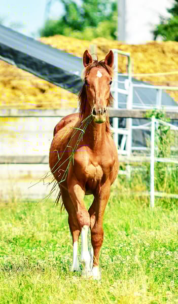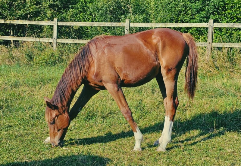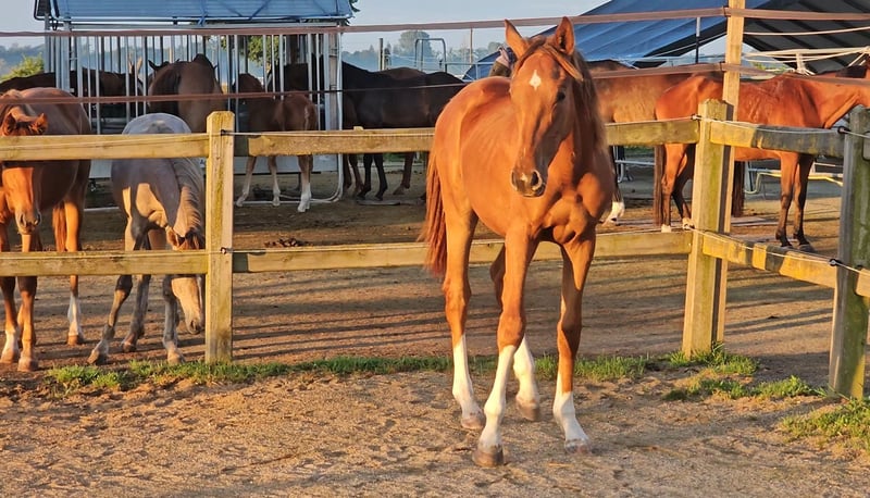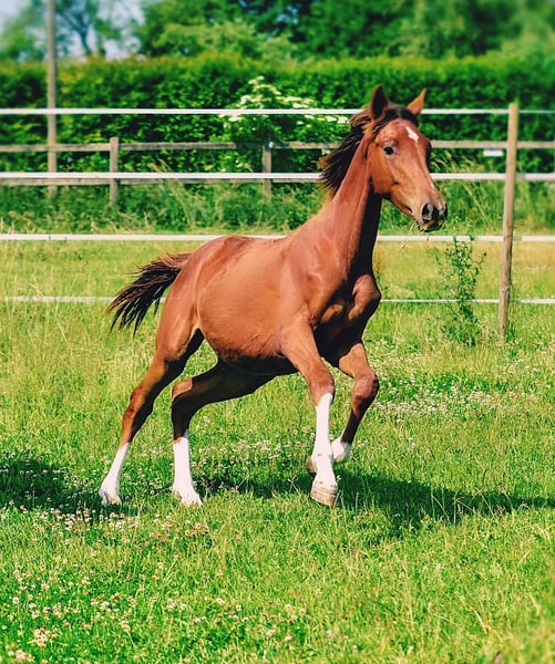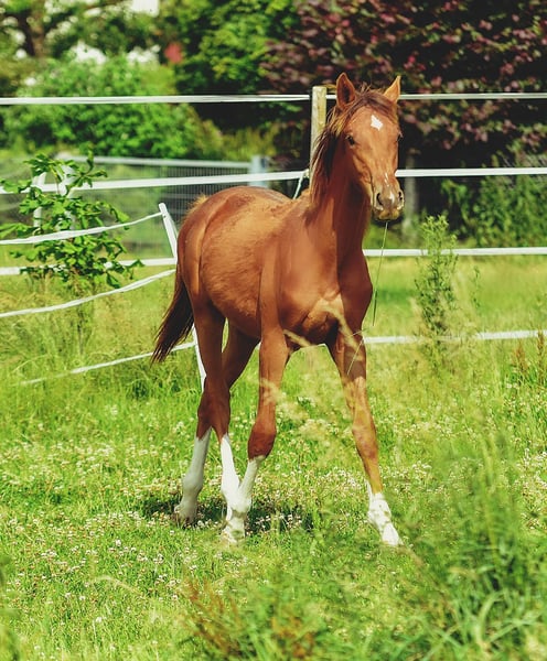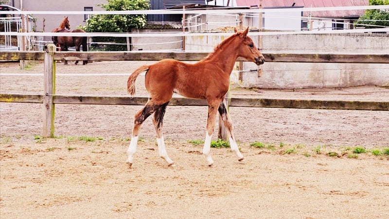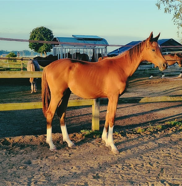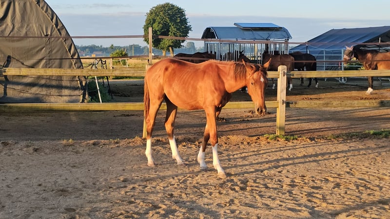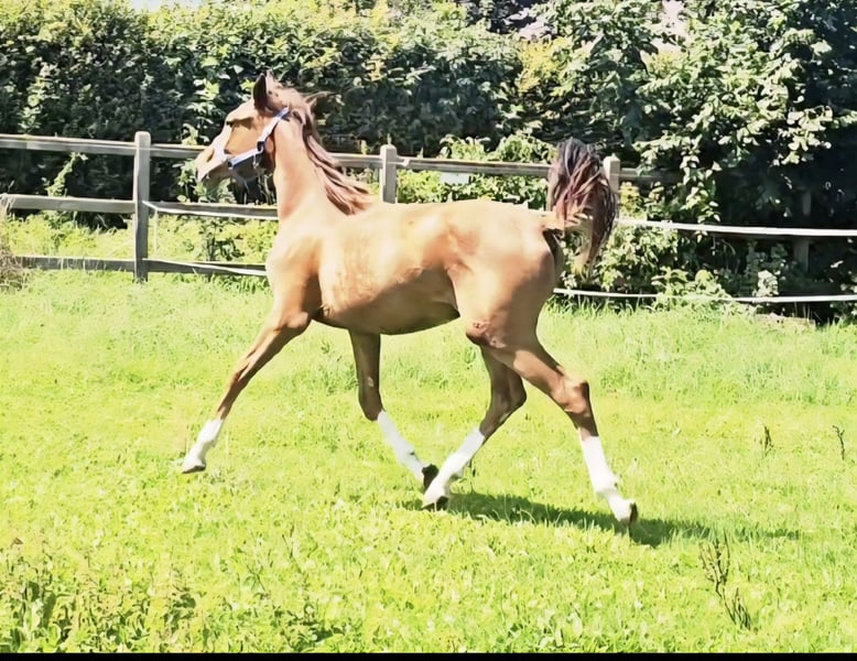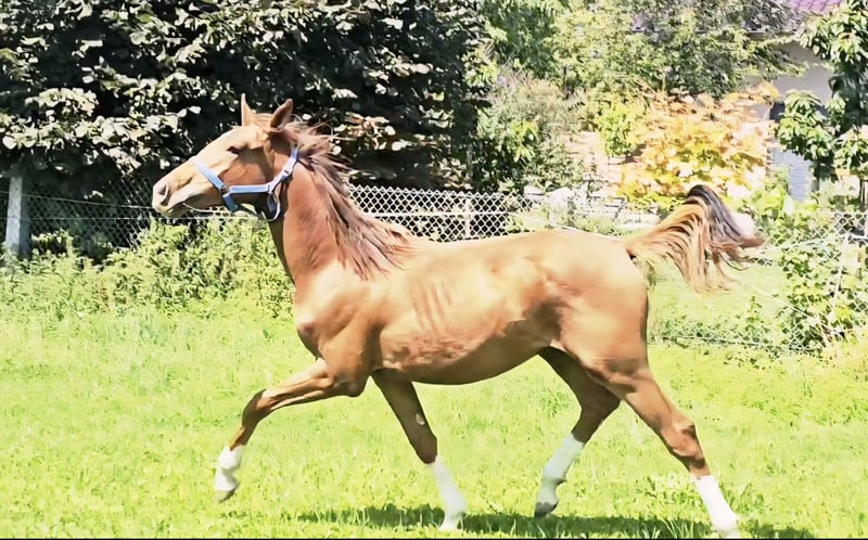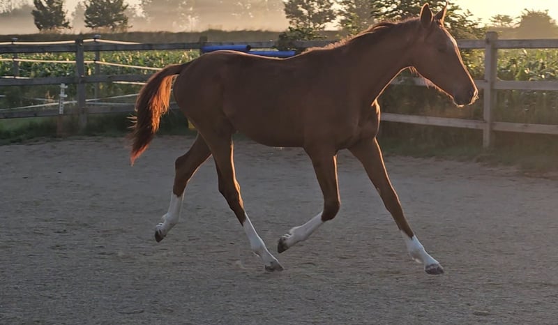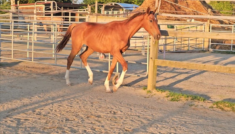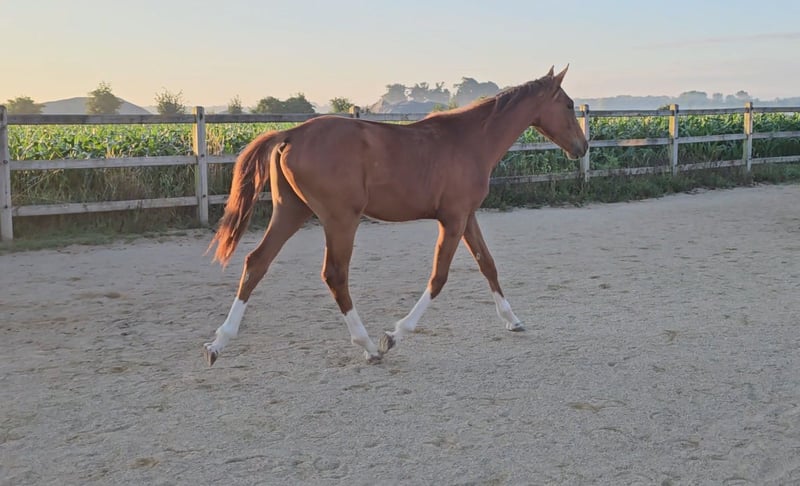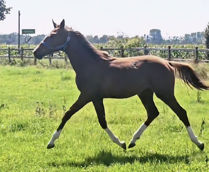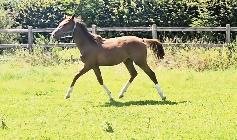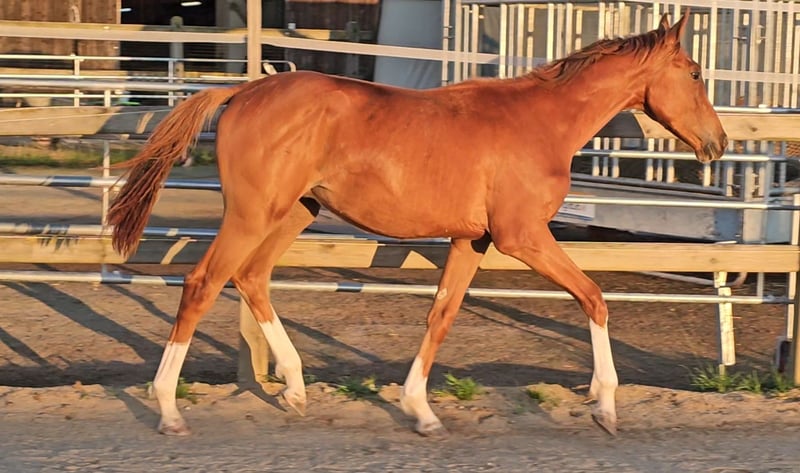 Four times bright white, star and snip, dark chestnut, elegant, modern sporty, clear-minded, people-oriented, well-behaved, excellent movement, healthy, solid foundation and joints, attractive head, brave, open-minded, curious, and very intelligent... These are just a few of his fantastic qualities. The beautiful, typy, double-licensed dressage gelding Captivates everyone with his top conformation as well as his incredibly balanced, friendly character. His pedigree: SAN TO ALATI (SECRET) × Topas × Totilas Both maternal and paternal lines leave nothing to be desired. His sire, SAN TO ALATI, is an exceptionally handsome son of Secret, bred from a dam by Belissimo x Florencio x Michelangelo/T. Behind him lies what is probably the most significant Trakehner lineage of the present day, the Herbstblüte line from the Schöning estate. As a stallion, his sire was Reserve Champion at the 14-day test in Adelheidsdorf 2021 and won the sport test in Münster-Handorf in 2022 with a score of 9.12. In 2022, he was crowned Hanoverian Champion with the same score of 9.12. He reached the grand final of the World Championships for Young Horses in 2023 and 2024 and was successful in dressage competitions up to M level. His dam combines two outstanding success lines in dressage and show jumping genetics. Pedigree includes Totilas, Sandro Hit, Corrado I, and Corde la Bryère. We are certainly looking for a sportive future for him in dressage or jumping, and an excellent home with a family environment. Please feel free to contact us for more information.