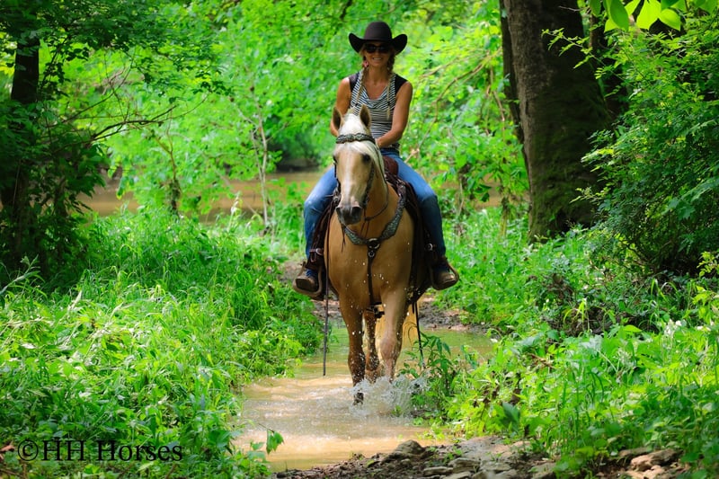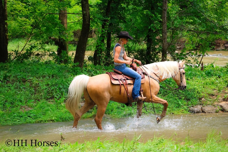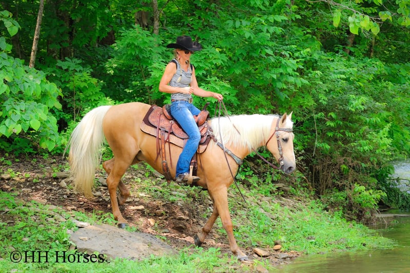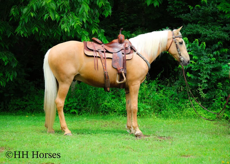 ONLINE AUCTION Place your bids at www.PlatinumEquineAuction.com Starting Bid $3500 Auction ends June 15th, 2025 Need a new saddle? Check out White Rock Saddles on our website or Facebook! This is “A Golden SUNBEAM”, one of the coolest, smoothest, and fanciest GOLDEN PALOMINO KENTUKCY MOUNTAIN GELDINGS around! He is well broke, extra handsome, and super fun to ride. He is 9 years old and stands 15 hands tall. He is very well built and has an attractive way of traveling. He has been out in the pastures to check cattle, in the mountains, and in the thick timber. He is sure footed and has lots of heart. He has a nice 4 beat gait, a super smooth collected canter, a solid stop, and a ONE HAND NECK REIN. He is a solid and seasoned trail mount that will go anywhere you point him without hesitation. He is brave and confident in the woods and will cross any depth of water. He rides on a loose rein and will only go as fast as asked of him. He is traffic safe, been in holiday parades, and hauled to the open shows. He has been shown in country pleasure and always catches the judges attention with his gorgeous color, suave movement, long mane, tail, and foretop. He is as fancy as they come and will ride for any level rider. He rides off in new surroundings quietly and is not afraid of wildlife, commotion, or lots of activity. He will ride in a group and has been on large, organized rides. He will ride in the front or the rear and doesn’t get hot. He’s a real special gaited gelding with color, shape, build, and ability. Call H&R Horses Erin 304-238-4155 to make a Buy It Now Offer or for more info. Located in Flemingsburg, KY. ONLINE AUCTION Place your bids at www.PlatinumEquineAuction.com Starting Bid $3500 Auction ends June 15th, 2025 Need a new saddle? Check out White Rock Saddles on our website or Facebook!