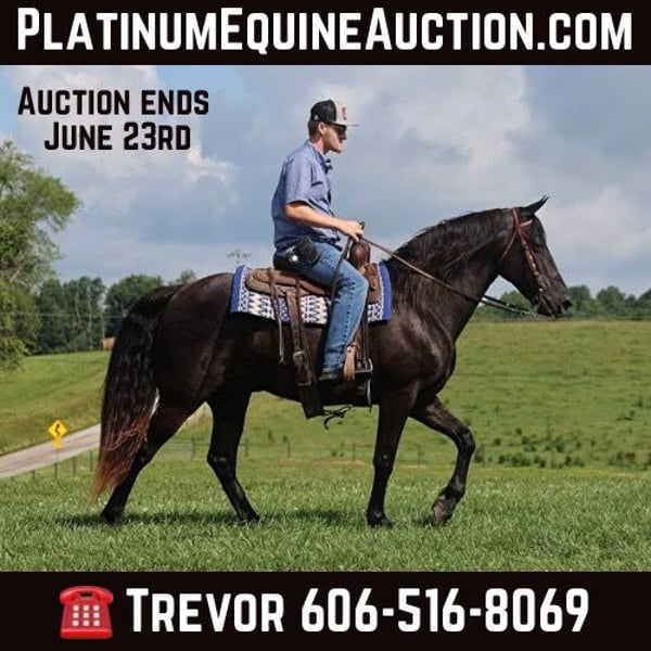 ONLINE AUCTION Place your bids at www.PlatinumEquineAuction.com Starting Bid $3500 Auction ends June 23rd, 2024 Need a new saddle? Check out White Rock Saddles on our website or Facebook! Dodge is a SUPER STOUT built 15.1hh, 10 yr old, Black Gelding and man oh man isn’t he a sharp looker? With that jet black color, he is dressed for a night out on the town, WOW he is a looker! I bought Dodge from some local folks who had owned him for 4 years. He has been trail ridden in several states, been ridden downt he highways and though town. Hes even been tied up at the hitching post at the local store while they went inside. Dodge has a natural 4-beat gait that is very smooth at all speeds for any rider. He has been ridden around farm equipment, ATV’s, and around noisy tarps. On the trails he is always great! Dodge has been exposed to all kinds of wildlife such as deer or turkey or other animals like cows or dogs and will go anywhere that he is asked too. He has been rode many miles in the mountains of Eastern Kentucky and encountered every obstacle possible on the trail. He will go up or down even the steepest slopes, across deep creeks, over downed trees, and over all types of rough terrain while still being sure footed. He has been rode in traffic, and is very traffic safe around cars, semi, log, and dump trucks. He has a great personality and a great attitude about whatever he is asked to do. Feel free to call Trevor Patrick 606-516-8069 with any questions. Located in Parkers Lake, KY. ONLINE AUCTION Place your bids at www.PlatinumEquineAuction.com Starting Bid $3500 Auction ends June 23rd, 2024 Need a new saddle? Check out White Rock Saddles on our website or Facebook!