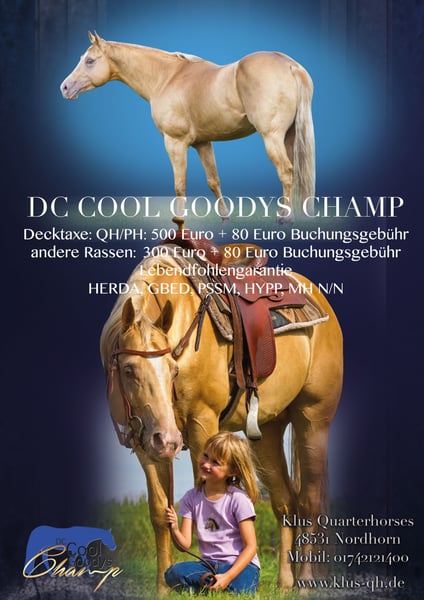 DC cool Goodys Champ A quart er stallion that is convincing. Licensed and registered Leistungsgeprüft in the Hengstbuch1 of the Zsse. Of course DQHA pass with pedigree registration for the quarter, paint, and Zsse. AQHA papers of course. Has a great building, a Sonderlakierung in gold champagne and How to read in his name, he is cool and serene. He wants to please always, is very docile, and comes with plenty of talent. A dream horse in Golden jacket and top character. His first offspring is just broken in and is very gelerig and easy to work. Pedigree: http://www.allbreedpedigree.com/DC+cool+goodys+Champ GBED N/N, HERDA N/N, PSSM1 N/N, MH N/N HYPP N/N Height 154 cm Stud fee 2019 €500 for quarter / paint = 580 euro €300 for other races and ZSSE = 380 euro + Booking fee € 80. Discount 2019 at time of booking up to the 31.01.2019 There are 50 euro discount on the stud fee and 10 euros on the booking fee. 450 Euro + 70 euro quarter/paint 250 Euro + 70 euro Zsse other breeds More info on my HP www.klus-qh.de DC can also be visited.