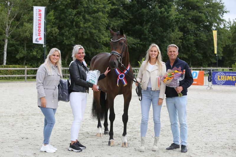 Oh Darling (2019) es una impresionante yegua de color negro-marrón con una altura de 1.73 m. En 2022 fue proclamada campeona de la Central Keuring (CK) en Groningen y enviada a la NMK (Exposición Nacional de Yeguas y Potros) en Ermelo, lo que confirma su calidad excepcional. Obtuvo 85 puntos en conformación y 80 en movimiento. Oh Darling es hija del semental I’m Perfect STH y proviene de la yegua de élite deportiva dressage PROK D-OC Donna STH (por Florencio I). Su padre ha demostrado su valía en la competición, lo que la hace genéticamente muy interesante para la cría. Durante la inspección, fue descrita como: “Una yegua bien desarrollada con bonitas proporciones y una parte delantera notablemente atractiva. Tiene fuertes conexiones en su estructura y una base correcta. Se mueve con buena impulsión, espacio, técnica y actitud.” En manejo, Oh Darling es una yegua tranquila y bien educada. Ha sido montada, aunque no es la más fácil bajo la silla. Por ello, la ofrecemos conscientemente como futura yegua de cría. Para alguien que invierte en calidad comprobada y genética fuerte, representa una oportunidad única. Totalmente aprobada radiológicamente y sin defectos.