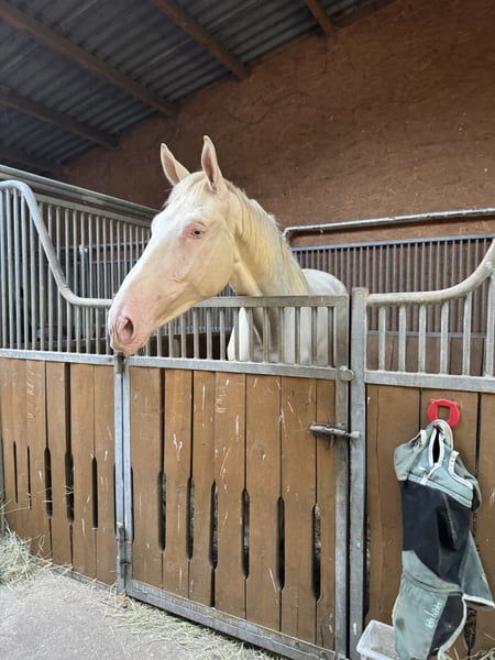 Caballo de Pura Raza Checa Kinsky – Cremello – 3 años – aproximadamente 1,85 m Aquí ofrezco un impresionante caballo gelding de 3 años de la raza Kinsky (cumplirá 4 años en abril) en el raro color especial Cremello. Altura actual de aproximadamente 180 cm, de constitución sólida y fuerte. Buena línea de sangre, el padre compite en doma y la madre en salto hasta 120 cm. El gelding todavía está en desarrollo y busca una persona experimentada que pueda entrenarlo y potenciarlo con paciencia. Debido a su edad, tamaño y temperamento, no es adecuado para principiantes. El Kinsky se distingue por su apariencia noble, buen movimiento y carácter enérgico y decidido. Está sano, solo presenta un sobrehueso en la parte derecha de la pata delantera, lo cual no le causa problemas. Condiciones de alojamiento: Necesitaría un entorno en el que los caballos puedan estar al aire libre, al menos desde la mañana hasta bien entrada la tarde, en verano e invierno. Lo ideal sería un paddock o establo abierto, con alguien con quien pueda jugar y correr, ya que aún es muy juguetón, pero no tiene mala relación con otros caballos. Motivo de venta: Debido a mi embarazo, actualmente y en el futuro cercano no puedo dedicarle suficiente tiempo y atención, por lo que, con mucho pesar, busco un lugar adecuado para él.