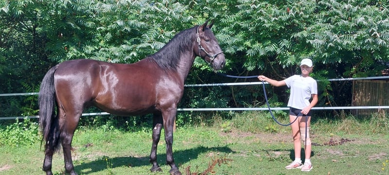 Very large, sturdy black Kladruber. 4 years old from a royal imperial stud. Our 4-year-old Kladruber is already well-trained and rides excellently in the three gaits in the indoor arena and on the sand arena. Sabonero is also regularly ridden out in the field and behaves exemplary. He has an elegant appearance, a gentle nature, is healthy, and full of potential. Well-mannered, curious, and eager to learn. Price is negotiable, and please make initial contact via WhatsApp.