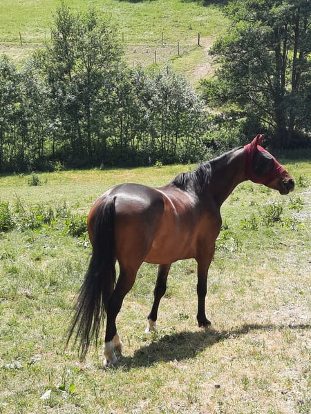 Ich suche nach einem neuen passenden Zuhause für meinen Wallach Sir Henry, da ich ihm aufgrund veränderter Lebensumstände zeitlich leider nicht mehr gerecht werde. Bitte die Anzeige bis zum Ende lesen. Ich habe Sir Henry nach den Grundzügen der klassischen Dressur selber ausgebildet. Er ist sehr fein zu reiten und möchte auf dem Reitplatz gefallen. Er kennt jegliche Seitengänge im Schritt und Trab auf feine Hilfen. Er ist sehr fleißig, lernbereit und stets lauffreudig. Ebenso im Gelände hat er ordentlich Go und ist dabei aber jederzeit händelbar. Er geht alleine als auch in der Gruppe ins Gelände. Aufgrund seiner Abstammung ist er auch fürs Springen geeignet und zeigt dabei große Motivation. Springen habe ich aufgrund fehlenden Equipments nicht weiter verfolgt, bis auf Cavaletti Hüpfer. Sir Henry ist temperamentvoll und daher nicht für Anfänger geeignet. Neben Reiten kennt er auch spazieren sowie Bodenarbeit/Longieren am Kappzaum. Er ist ein aufgeschlossenes und sensibles Pferd und ist gut erzogen. Bei neuen/fremden Personen testet er das erst mal aus. Wer ihm eine klare Führung gibt, hat ihn für sich gewonnen. Sir Henry ist Barhufer und lebt aktuell im Offenstall mit 12 Pferden. Dort ist er Herdenchef und macht den Job gut. Er ist sozialverträglich, spielt und schmust gerne mit seinen Artgenossen. Sir Henry ist schmiede- und verladefromm, regelmäßig geimpft und entwurmt. Die Zähne wurden das letzte Mal im Juli professionell gemacht. Ich wünsche mir ein liebevolles Zuhause im Offenstall in einer überschaubaren Herde mit ausreichend Fress- und Liegeplätzen. Keine Boxenhaltung. Ich verkaufe mein Pferd weit unter Wert, da er aktuell noch 2x täglich Medikamente gegen Magengeschwüre am Magenausgang bekommt. Aus dem Grund steht er aktuell körperlich nicht so gut da, hat abgenommen und ist wenig bemuskelt (die 2 letzten Bilder). Dennoch ist er gut drauf, fit und munter. Da ich wenig Zeit habe und ihm die Zeit zur Regenation geben möchte, habe ich ihn seit Juni nicht mehr geritten. Sobald er wieder vollumfänglich einsatzbereit ist, ist er ein toller Freizeitpartner und Reitpferd. Ich kann keine Prognose abgeben, wie lange er noch Medikamente benötigt und übernehme dahingehend keine Garantie. Für seine Genesung ist ein passendes und liebevolles Zuhause ausschlaggebend, wo er zur Ruhe kommen kann (die Ruhe fehlt ihm aktuell). Zudem ist er leichter Sommerekzemer. Je nach Sommer reicht ein Öl in Schweifrübe und Mähnenkamm alle 2-3 Tage oder bei stärkerem Juckreiz hilft ihm eine Ekzemerdecke, womit er super klar kommt. Seine Fütterung habe ich auf Sommerekzemer sowie magenempfindliche Pferde entsprechend angepasst. Ich gebe Sir Henry mit vollem Equipment ab (u.a. Kieffer Lousitano Dressursattel, Trense, Hufschuhe, Decken, Futter, Medikamente, etc.). Sir Henry hat volle Papiere (Equidenpass + Urkunde). Probereiten nur, wenn alles passt. Kein Händler oder Schulbetrieb. Platz vor Preis! Mir ist wichtig, dass Sir Henry in bester Hände kommt. Bei Interesse freue ich mich über eine kurze Vorstellung Ihrer Person sowie Beschreibung der Haltungsform.