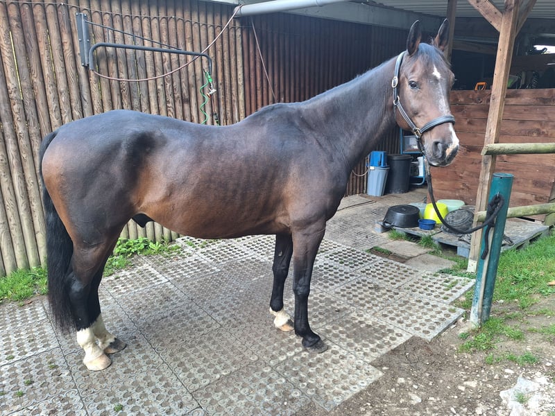 I am looking for a new suitable home for my gelding Sir Henry, as I can no longer meet his needs due to changed life circumstances. Please read the ad to the end. I have trained Sir Henry myself according to the basic principles of classical dressage. He is very sensitive to ride and wants to please in the riding arena. He knows all lateral movements in walk and trot with fine aids. He is very diligent, eager to learn, and always keen to go. He also has plenty of energy in the field and is manageable at all times. He goes out alone as well as in a group. Due to his lineage, he is also suitable for jumping and shows great motivation for it. I have not pursued jumping further due to a lack of equipment, except for cavaletti jumps. Sir Henry is spirited and therefore not suitable for beginners. In addition to riding, he is familiar with walking and groundwork/lunging with a side reins. He is an open-minded and sensitive horse and is well-mannered. With new/strange people, he will test the waters first. Whoever provides him with clear leadership has won him over. Sir Henry is barefoot and currently lives in a paddock with 12 horses. There he is the herd leader and does the job well. He is sociable, enjoys playing and cuddling with his companions. Sir Henry is shoe-friendly and loading-friendly, regularly vaccinated and dewormed. His teeth were last professionally done in July. I wish for a loving home in a paddock with a manageable herd and plenty of feeding and lying spaces. No box housing. I am selling my horse well below value, as he is currently still receiving medication for gastric ulcers at the pylorus twice a day. For this reason, he is currently not in good physical condition, has lost weight, and is not well-muscled (the last two pictures). Nevertheless, he is in good spirits, fit, and lively. As I have little time and want to give him the time for recovery, I have not ridden him since June. Once he is fully ready for use again, he will be a great leisure partner and riding horse. I cannot provide a prognosis on how long he will need medication and do not take any responsibility in this regard. A suitable and loving home is crucial for his recovery. Additionally, he is a mild summer eczema sufferer. Depending on the summer, an oil on his tail and mane every 2-3 days is sufficient, or a fly sheet helps him with stronger itching, which he copes with very well. I have adjusted his feeding accordingly for summer eczema and horses with sensitive stomachs. I am offering Sir Henry with full equipment (including Kieffer Lousitano dressage saddle, bridle, hoof boots, blankets, feed, medications, etc.). Sir Henry has full papers (Equine passport + certificate). Trial riding only if everything fits. No dealers or riding schools. Home before price! If you are interested, I look forward to a brief introduction of yourself as well as a description of the housing situation.