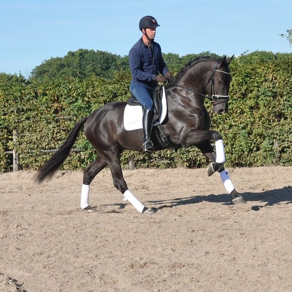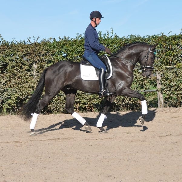 Shadowman is one of our crossbreeding successes and truly amazing, nice, qualitative, trustworthy horse! Super easy and relaxed by hand. Super safe under saddle, also when he wasn’t worked for 3 weeks! Not spooky or nervous. A lot of go, sharp on the leg aids but not scared of the leg. Soft and quiet in the contact but not scared of the bit or hand. Despite we do not ride him a lot, mostly twice a week, he is far ahead of his age! He understands all lateral work already, a flying change mostly as well. What proves his brain, willingness to work and ability to learn are outstanding! Besides this he has a very good walk which does not show under saddle completely jet. He finds to collect way easier as to extend. A trot with a lot of action, of ground and handiness. His canter is sensational! Very uphill, powerful, off ground and big! Bus as easy as he goes very big, he can also collect back! Which is exceptional al this age in our experience... Sire Secret is known as a producer of very nice character and enormous movement! His first crop of offspring represented no less than 25% of the participating 5-year-olds at the WC Young Dressage Horses! And numerous licensed stallions! Mother Modosa is a big, pleasant mare with an enormous will to work and learn. And she still amazes many people how easy a horse can be!