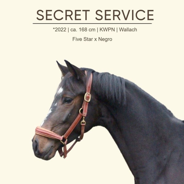 Ce jeune cheval de rêve impressionne par son allure et sa haute qualité dans les trois allures fondamentales. SECRET SERVICE est en train d’être monté de manière solide et adaptée à sa morphologie, il se montre toujours motivé et désireux de plaire. Son caractère équilibré et gentil en fait un partenaire particulièrement agréable. En manège, il est totalement facile, calme et adorable. Un jeune cheval prometteur de grande qualité, qui fascine par sa prestance et sa qualité de mouvement. Radiographies récentes disponibles !