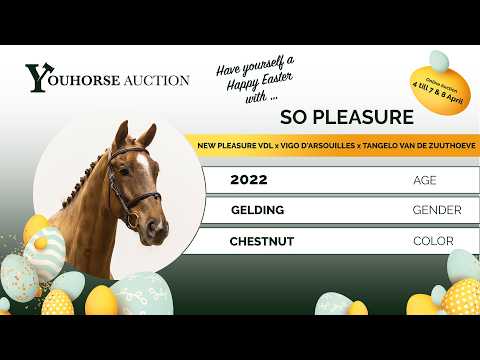 So Pleasure is een langgelijnd, grootramig sportpaard dat direct opvalt door zijn uitstraling en vermogen. Een modern paard met een aansprekend model en veel kwaliteit. Hij straalt kracht uit en laat zien dat hij over veel aanleg beschikt. Op de sprong toont hij veel vermogen, is hij snel van de grond en komt hij voorzichtig over. Hij trekt goed aan naar de sprong en laat een zeer goede instelling zien. Ondanks dat hij nog maar kort onder het zadel is, laat hij al een opvallend goede sprong en rijdbaarheid zien. Een bovengemiddeld paard met werkbaar en fijn bloed, dat zich makkelijk laat ontwikkelen en de ruiter een goed gevoel geeft. Vader New Pleasure VDL springt op 1.45m niveau en is een zoon van For Pleasure (1.60m), één van de meest invloedrijke verervers wereldwijd. Moeder N is een dochter van Vigo d’Arsouilles (1.60m) en komt uit een uitzonderlijk sterke prestatiestam. De moederlijn is zeer sterk en brengt meerdere internationale sportpaarden: Jean Couture (1.60m) Marseille (1.60m) Mr. Incredible (1.60m) Fancy (1.60m) Half of My Heart (1.55m) meerdere paarden op 1.45m–1.60m niveau Een stam met bewezen prestaties op het hoogste niveau.