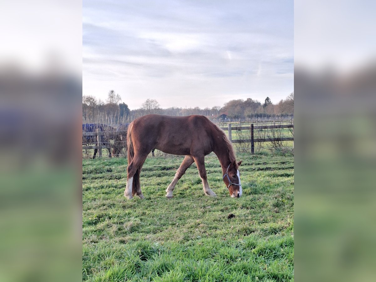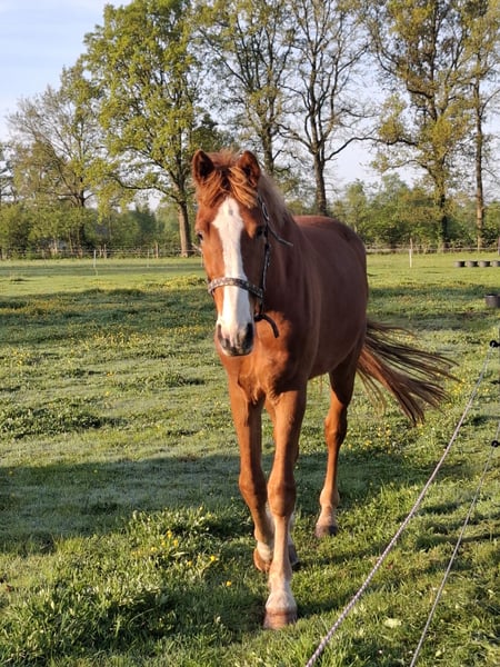 Sweet chestnut gelding seeking a loving new home – will turn 4 in April Storm (Kane BFT x Victory) is a chestnut gelding approximately 1.65 m tall, currently 3 years old. He will be 4 in April. He is still untrained and completely open to being shaped according to his new rider! A beautiful young horse to work with and develop together. He walks nicely on the lead and is easy to groom. We bought him at one year old, so his history is well known. His first owner is also known to us. He is not easily spooked by new things, has a healthy dose of curiosity and humor. If we had to describe him in one word, it would be: Honest! He has nice, solid legs and is correctly built. Recently dewormed. Storm has sweet itch (summer eczema), but this is well managed with proper care and his eczema blanket (Snuggyhoods). His eczema blankets will of course go with him. Currently, Storm is turned out 24/7 (day and night) in the pasture, with a 50-gram outdoor blanket, and is doing great. He shares his paddock with two mares but can also be kept in a group with geldings. He easily finds his way in a herd and prefers to be friends with everyone! Reason for selling: due to a baby, there is not enough time to properly train a young horse. Storm can be viewed in Epe (Gelderland). Asking price is open for offers!