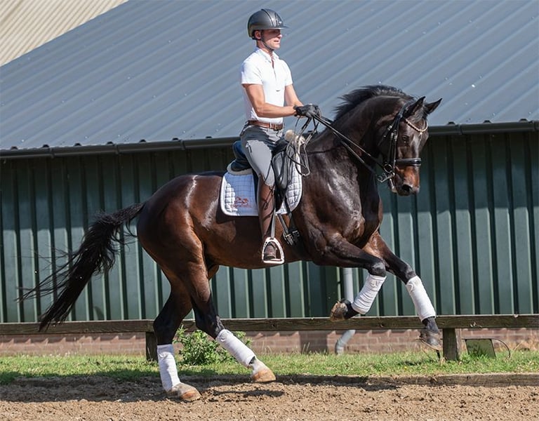 Newsation is an 8-year-old horse that is classified in the Z1 class (3rd/4th level). He is already trained at a higher level at home and moves with great ease, with his powerful trot standing out. Not only is the trot striking, he also walks and canters with a fine technique. Newsation comes from a sporty damline. Sire is the stallion Sensation, approved in Oldenburg and Westphalian. He is a son of Sir Heinrich and further on we find the stallion Casparino. Granddam Zwyrintha produced the Grand Prix horse and approved stallion Nespresso, successful under Charlotte Fry and also the Small Tour horses Golden Queen (by Charmeur) and Irintha (by Everdale).