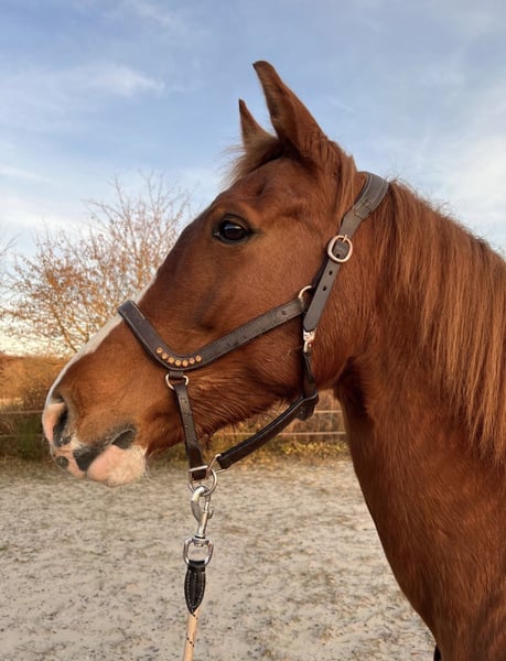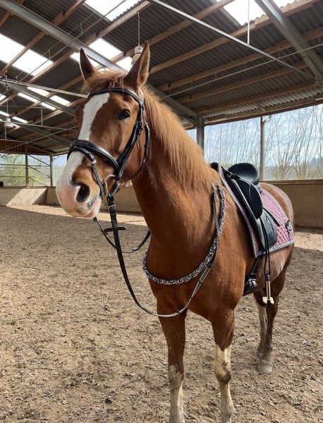 Zum Verkauf steht wegen Reitsportaufgabe, eine super schicke, bunte Fuchststute. Hero x Metall In ihren jungen Jahren wurde die Stute in Belgien bei einer Dressurreiterin gekauft, dort ging sie auch ein paar Turniere, auf Dressurpferde A Niveau (in Belgien sind die Klassen etwas anders- dort hieß es Level L). Wir haben sie als „Familienpferd“ gekauft und sie hat uns viel Freude beschert. Egal ob beim Ausritt, Lehrgang, Reitstunde oder wenn ich mal eins meiner Kinder darauf gesetzt habe. Sie ist rein englisch geritten, kennt aber den Westernsattel. Sie ist allerdings nicht anfängertauglich oder für ängstliche/ schwächere Reiter geeignet, da sie schon „wach und an ist“ und auch mal hinterfragt wie ernst man das ganze meint, was man von ihr möchte. Für den gehoben Freizeitreiter der Spaß am Dressurmässigen Arbeiten hat - der ideale Partner. Steht bei uns im Sommer 24h in einer gemischten Herde draußen, im Winter geht sie den ganzen Tag aufs Paddock. Sie braucht viel Auslastung und Bewegung, daher sehen wir sie nicht in reiner Boxenhaltung mit nur 2-3 Stunden Auslauf am Tag. Verladen lässt sie sich gut. Sie steht in 66440 Blieskastel und kann gerne ausprobiert werden, wir wünschen uns ein schönes familiäres zu Hause