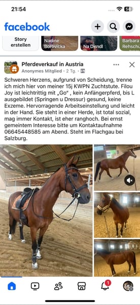 Tolle, gesunde Stute, 15 j, unverbraucht und mit viel Go. Suche für sie einen entspannten Menschen. Platz vor Preis. Siehe Bild mit Anzeige. Sehr soziale Stute, eingetragene Zuchtstute, tolle alte Abstammung. Kerngesund, robust