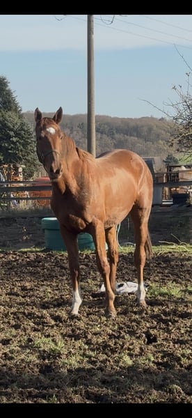 For sale is a mare born in 2023. She is sired by Emerald out of Tangelo. She currently measures approximately 16.1 hands and will likely grow to over 17 hands. She has not been trained yet and is still living out in the pasture. She can be viewed at any time.