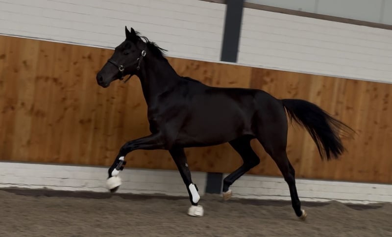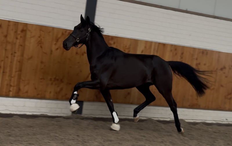 Cheval de dressage jeune de très haute qualité, issu d'une lignée maternelle solide et sœur du top étalon Security (v. Secret). Modèle attrayant et jeune, avec beaucoup de présence. Se déplace avec puissance et technique, possède un bon équilibre et beaucoup de souplesse. Trois allures excellentes. Correct au niveau des membres, avec des pieds réguliers. Sort du troupeau et montre un caractère agréable dans le travail. Radiographiquement, 100 % en ordre.